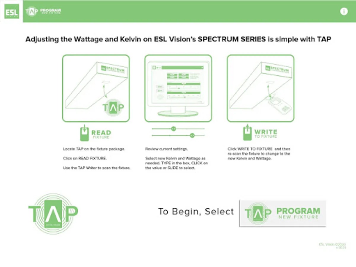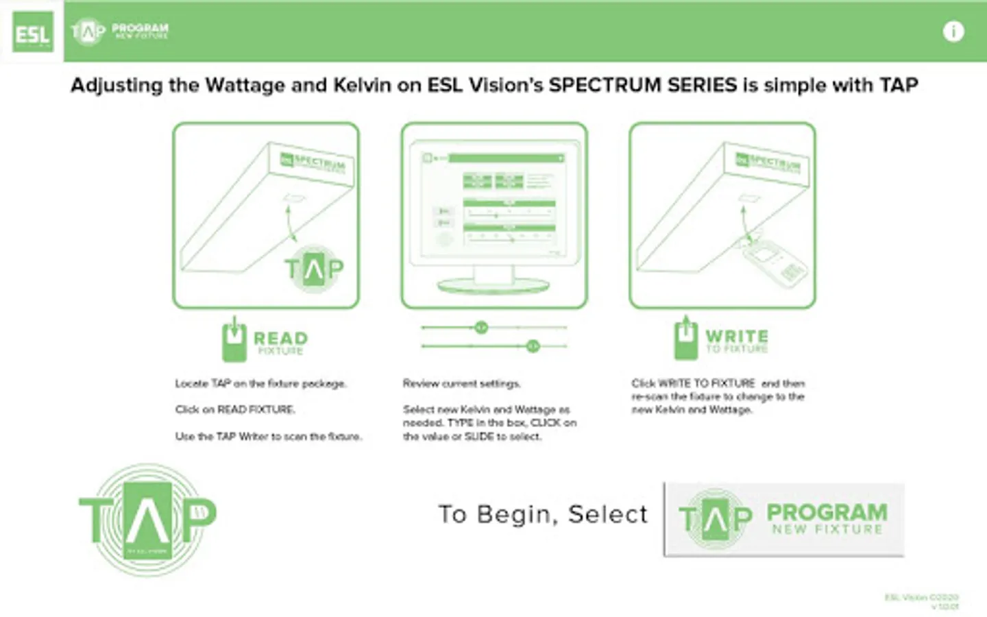 ESL Vision introduces the Spectrum Series featuring TAP technology; a cutting edge family of wirelessly controlled lighting fixtures that are both wattage adjustable and kelvin tunable. Each Spectrum Series fixture is embedded with ESL Vision's patent pending TAP technology.