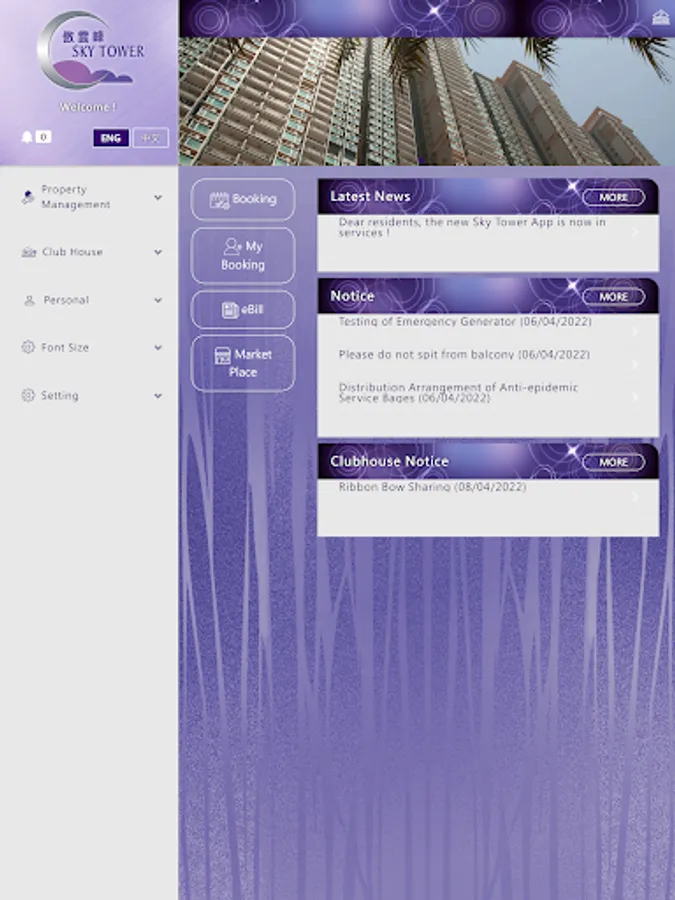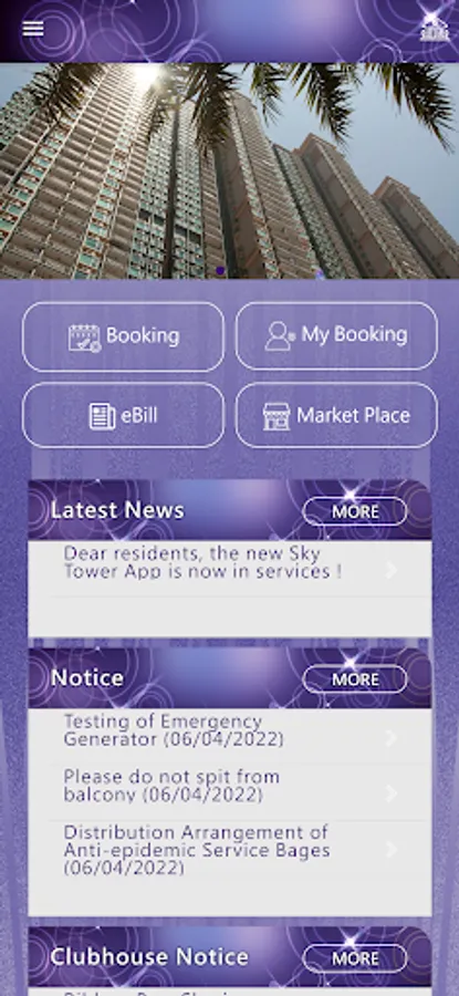 Dear residents, Sky Tower property App is now has a brand new look, providing more features and more convenience. You can login the app via your mobile phone or tablet to make facility reservations, receive our instant messages, check management fee eBill, etc. You can also use our Market Place to publish a small ad, please experience the new platform for Estate Management services immediately.