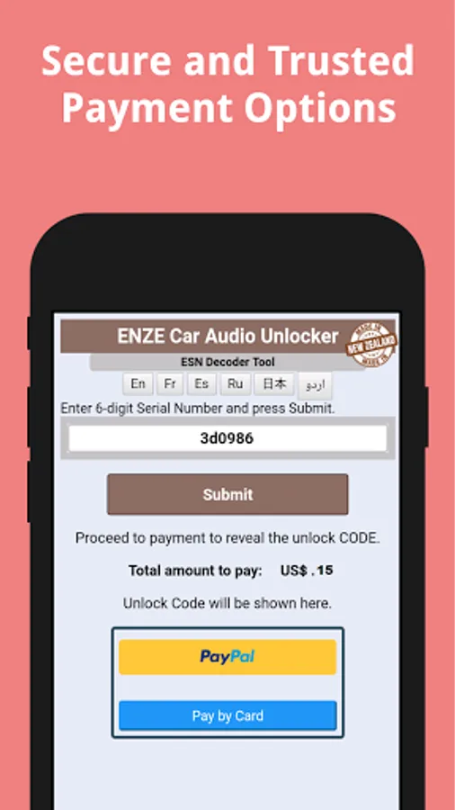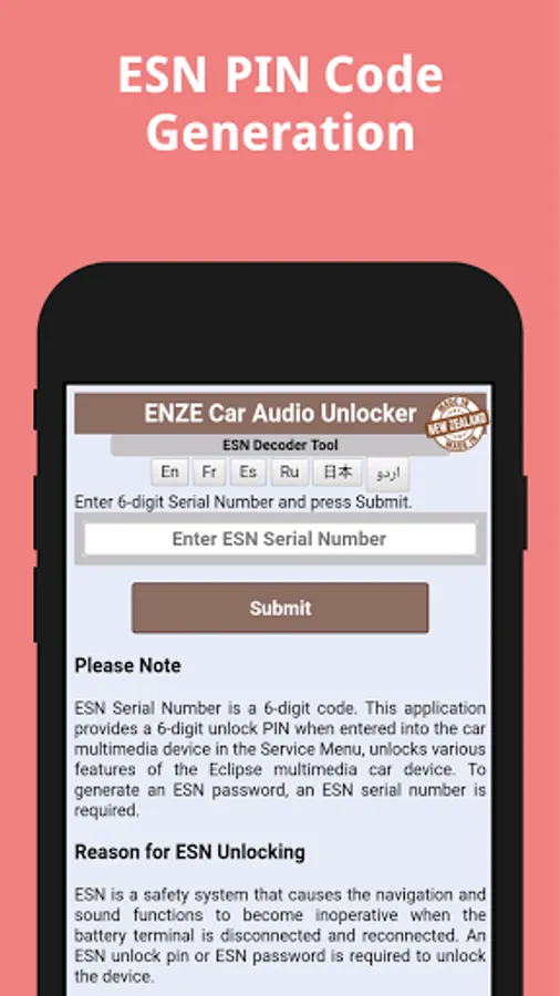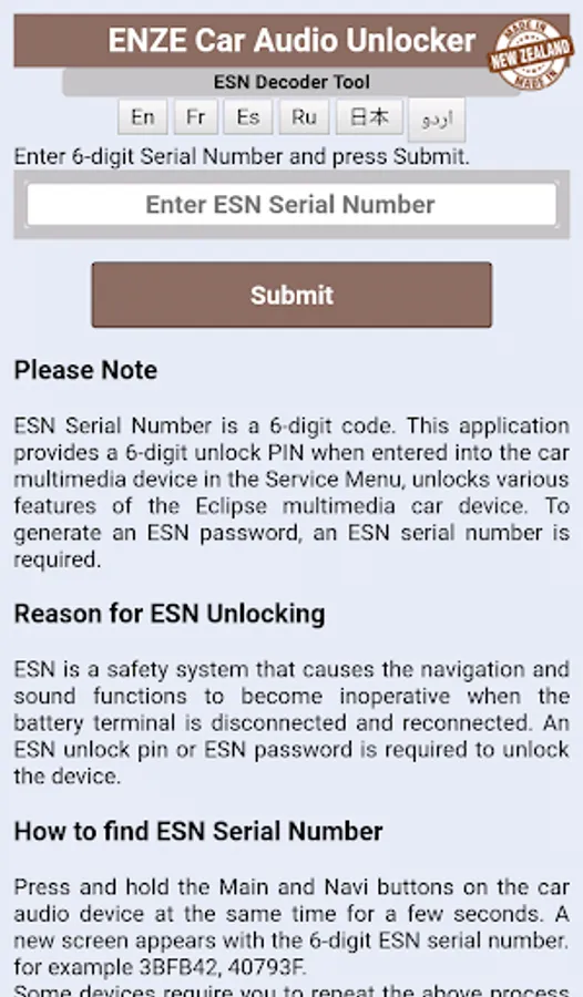 This application could be used to generate a 6-digit unlock PIN when entered into the car multimedia device at ESN Pin screen, could unlock various features of the Car Audio Unit.