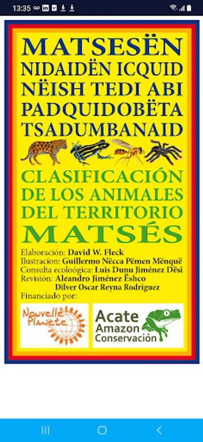 This 129-page application is the first of its kind. It illustrates the amazingly high animal diversity found Western Amazonia along with the sophisticated traditional ecological knowledge of the Matses people with illustrations of 504 species of animals drawn by Matses artist Guillermo Nëcca Pëmen Mënquë. It contains audio clips for the Matses names of all 504 species in the book. The application contains drawings of almost all the animal species that have names in the Matses language. It illustrates species in all the major categories of animals present in the Matses territory, including mammals, birds, reptiles, amphibians, fish, insects, centipedes, arachnids, crustaceans, mollusks, worms and other invertebrates. More than 200 animal families in 82 orders are represented. Matching of Matses animal names to animal species was carried out by Dr. David w. Fleck in consultation with Matses elders using published field guides, photographs and audio recordings of animal calls. Dr. Fleck is a biologist and linguist who has been living with the Matses and conducting biological, linguistic, ethnographic, and ethnobiological research with them since 1994.