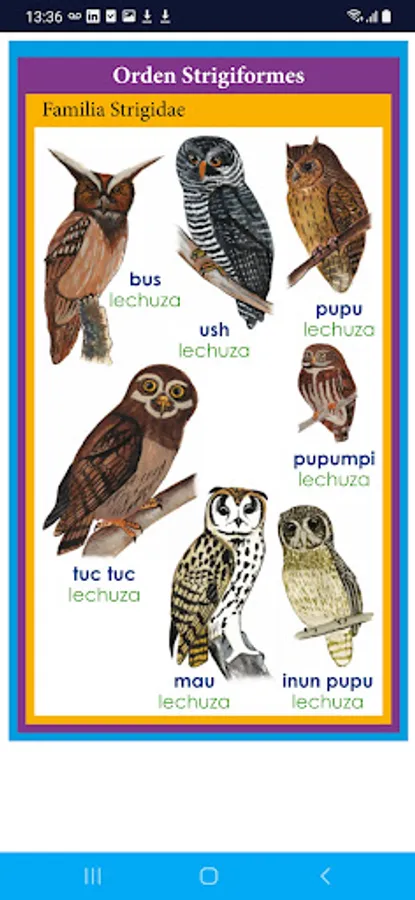 This interactive educational application features drawings of the local fauna of the Amazonian rainforest of Peru, with names of the animals in the Matses language and in local Spanish, accompanied by sound clips of the Matses names that play when clicked. The animals are organized taxonomically according to the phylum, order, and family to which they belong. The main purposes are to familiarize indigenous Matses students with scientific classification and to encourage intergenerational transmission of traditional ecological knowledge. It can be used by emergent readers to learn to read at the word level in Matses. Non-Matses will find this application useful for familiarizing themselves with the fauna of Amazonian Peru, and for learning the vernacular Spanish terms for these animals.