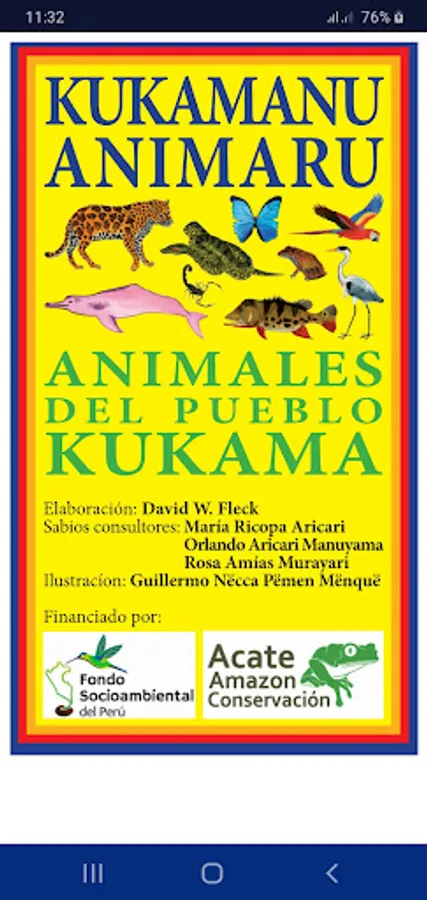 This 134-page application is part of a series of applications in Peruvian indigenous languages, which so far includes Matsés and Iskonawa. Illustrates the extraordinarily high diversity of animals found in the western Amazon along with the sophisticated traditional ecological knowledge of the Kukama people, using illustrations of 493 animal species drawn by Matsés artist Guillermo Nëcca Pëmen Mënquë, each accompanied by an audio clip. from the name pronounced by a native speaker of the Kukama language. The app contains images of almost all animal species that have names in the Kukama language, including mammals, birds, reptiles, amphibians, fish, insects, centipedes, spiders, crustaceans, molluscs, worms, and other invertebrates. More than 200 animal families are represented in 77 orders. The Kukama names were compiled by Dr. David W. Fleck in consultation with learned Kukama speakers, using published dictionaries, field guides, photographs, and audio recordings of animal songs.
