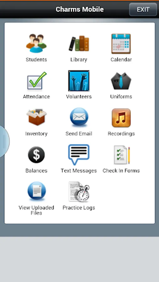 Charms Mobile offers the administrator of a Charms account access to many functions on their mobile devices, including student records, inventory lists, attendance, student recordings, library searches, financial reports, and lots more. It also includes a barcode component for checking in and checking out Uniform and Inventory items, as well as checking in students for attendance tracking.