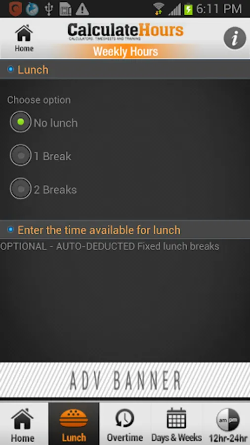 You may add more login lines for 1 or 2 lunch breaks. Or, if you do not log in and out for lunch each day, but has a certain amount of minutes automatically deducted as lunch, you may enter 15 minutes, 30 minutes etc. in the LUNCH tab, and this amount will be automatically deducted daily.