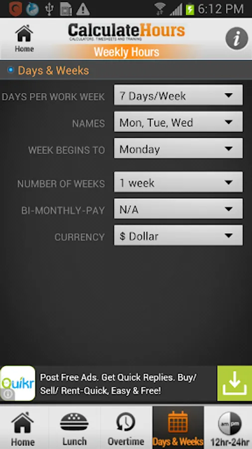 Set your number of work-days per week, the names of the days, and the day your week begins for the purposes of your pay period. Choose between a weekly or a bi-weekly pay period.