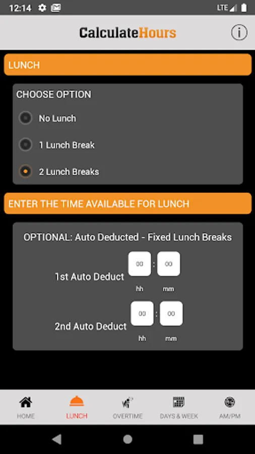 You may add more login lines for 1 or 2 lunch breaks. Or, if you do not log in and out for lunch each day, but has a certain amount of minutes automatically deducted as lunch, you may enter 15 minutes, 30 minutes etc. in the LUNCH tab, and this amount will be automatically deducted daily.