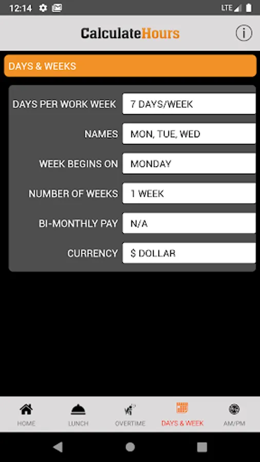 Set your number of work-days per week, the names of the days, and the day your week begins for the purposes of your pay period. Choose between a weekly or a bi-weekly pay period.