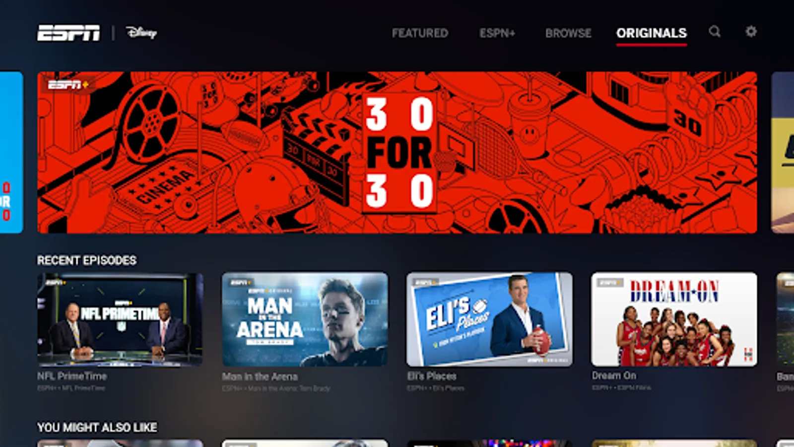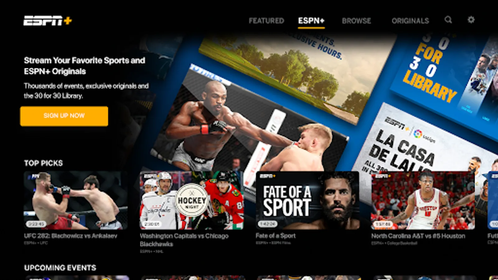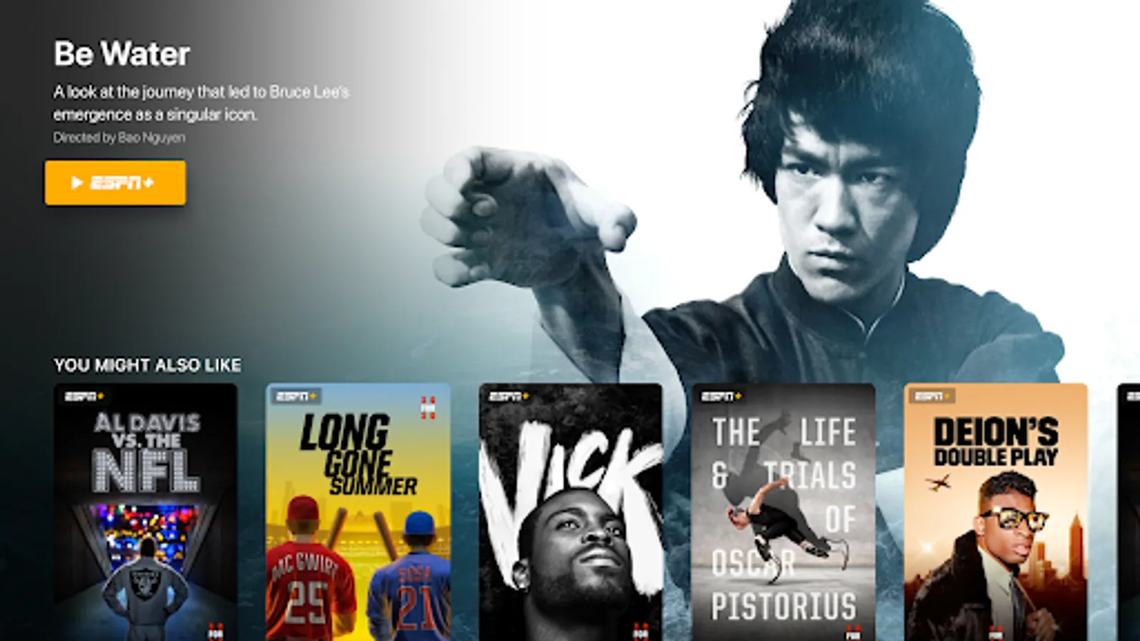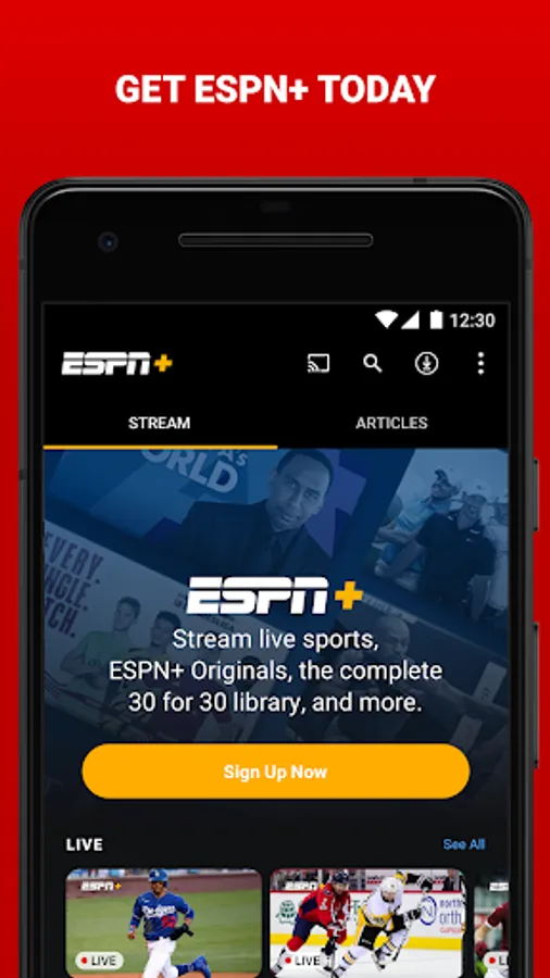 Sign up for ESPN+ and get access to the streaming service that delivers live sports from the best leagues and teams in the world. Get live events from the UFC, MLB, PGA TOUR LIVE, NHL, LaLiga and Bundesliga, college football, basketball, and more. Enjoy the complete 30 for 30 library and exclusive ESPN+ Originals from the biggest names in sports including Tom Brady, Derek Jeter, Peyton Manning, Dana White, Abby Wambach, and more all inside the ESPN app.