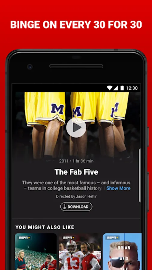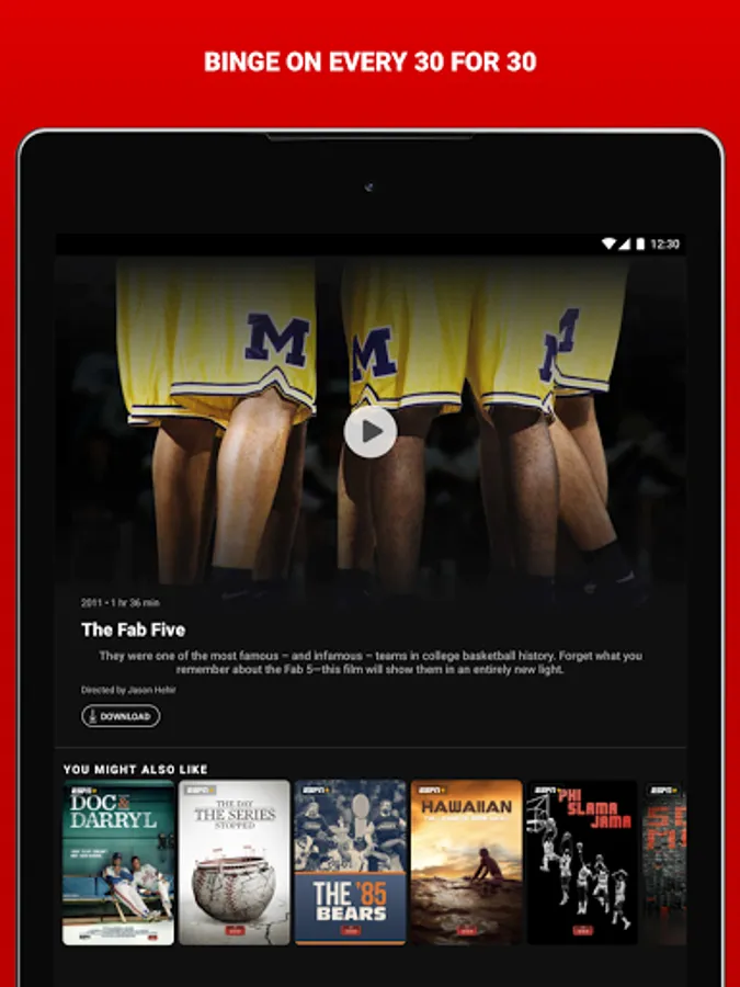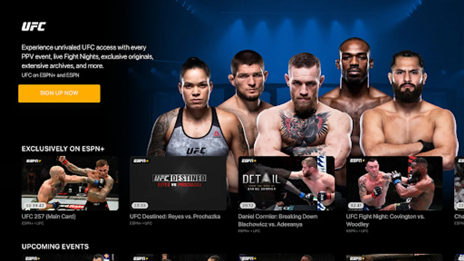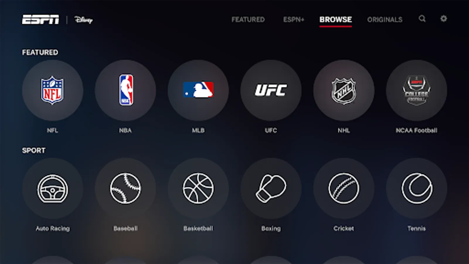 Sign up for ESPN+ and get access to the streaming service that delivers live sports from the best leagues and teams in the world. Get live events from the UFC, MLB, PGA TOUR LIVE, NHL, LaLiga and Bundesliga, college football, basketball, and more. Enjoy the complete 30 for 30 library and exclusive ESPN+ Originals from the biggest names in sports including Tom Brady, Derek Jeter, Peyton Manning, Dana White, Abby Wambach, and more all inside the ESPN app.