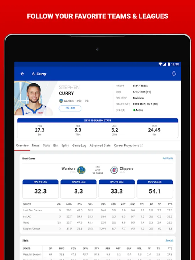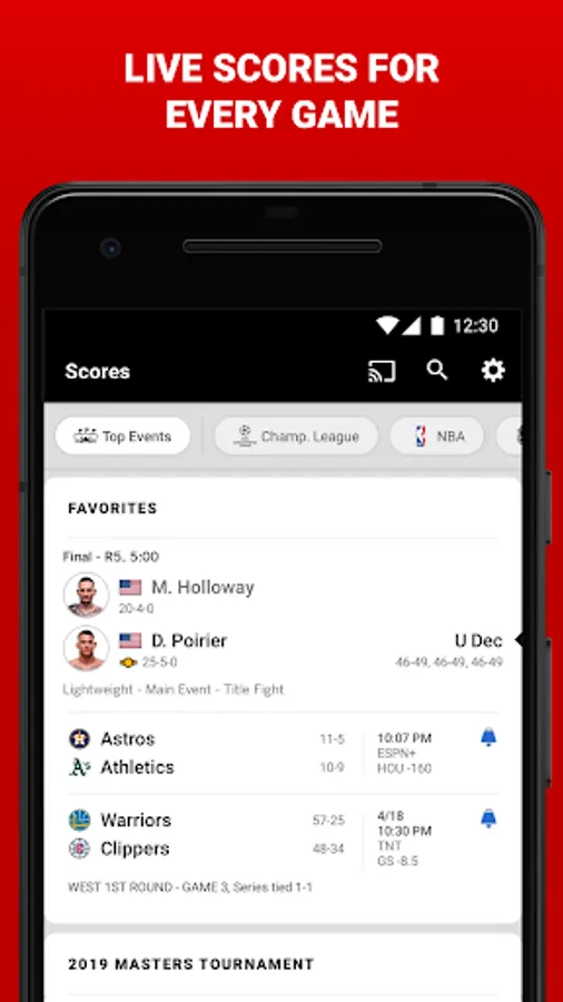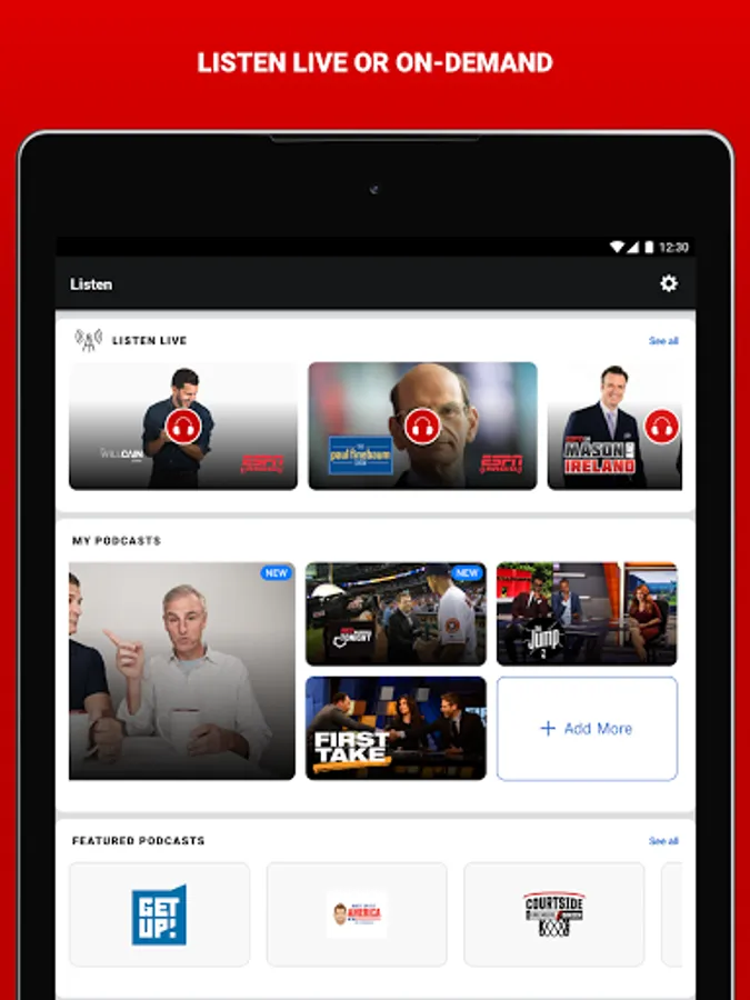 Highlights and scores from what you care about. From news about your favorite sports or team playing right now, the home tab has you covered. Fast access to scores for your favorite teams and leagues and the top games of the day in the scores tab. Also, subscribe to your favorite ESPN Podcasts or listen live to ESPN Radio.