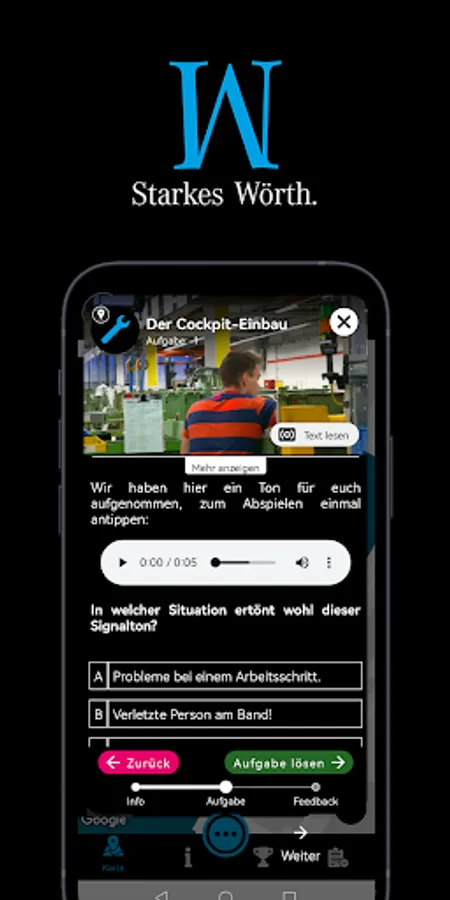The family day app offers you an interactive experience where you can explore the factory premises in Wörth and solve tricky tasks at the same time. Use the integrated digital wayfinding system to easily navigate the site and not miss any of the exciting stations. Whether inside the factory or outside - the app takes you to fascinating places and provides interesting tasks along the way.