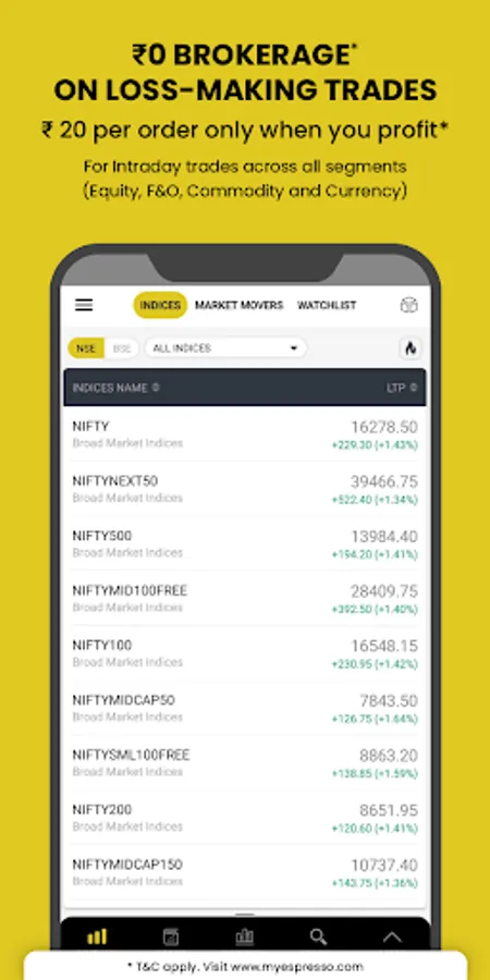 • Espresso offers the unique PAY ONLY WHEN YOU PROFIT pricing at Rs 20/order across Equity, F&O, Commodity and Currency segments
