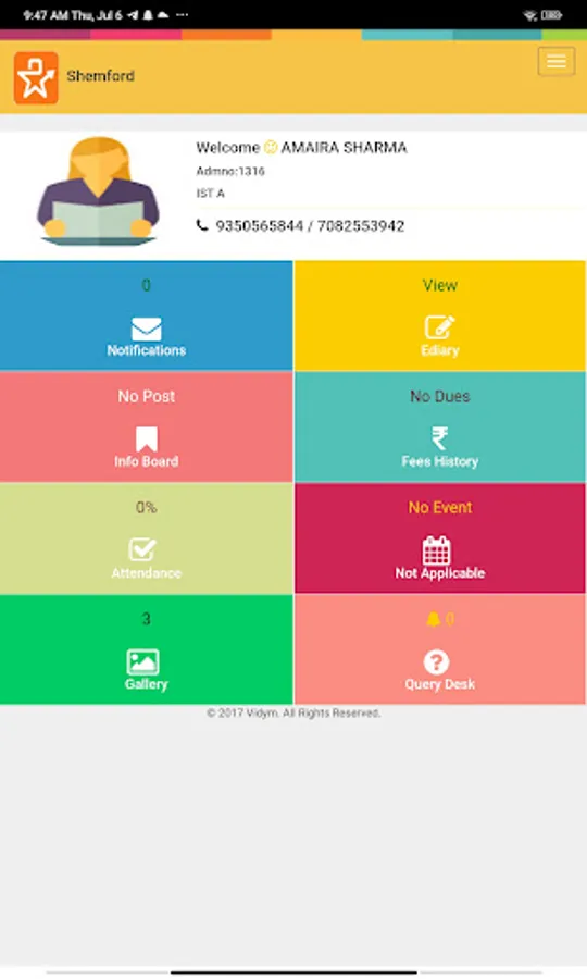 Vidym Senior allows parents of wards studying in school to access : classwork, homework, see attendance of their children. Any notice published by school is available on this app. Parents can also access school activity gallery.