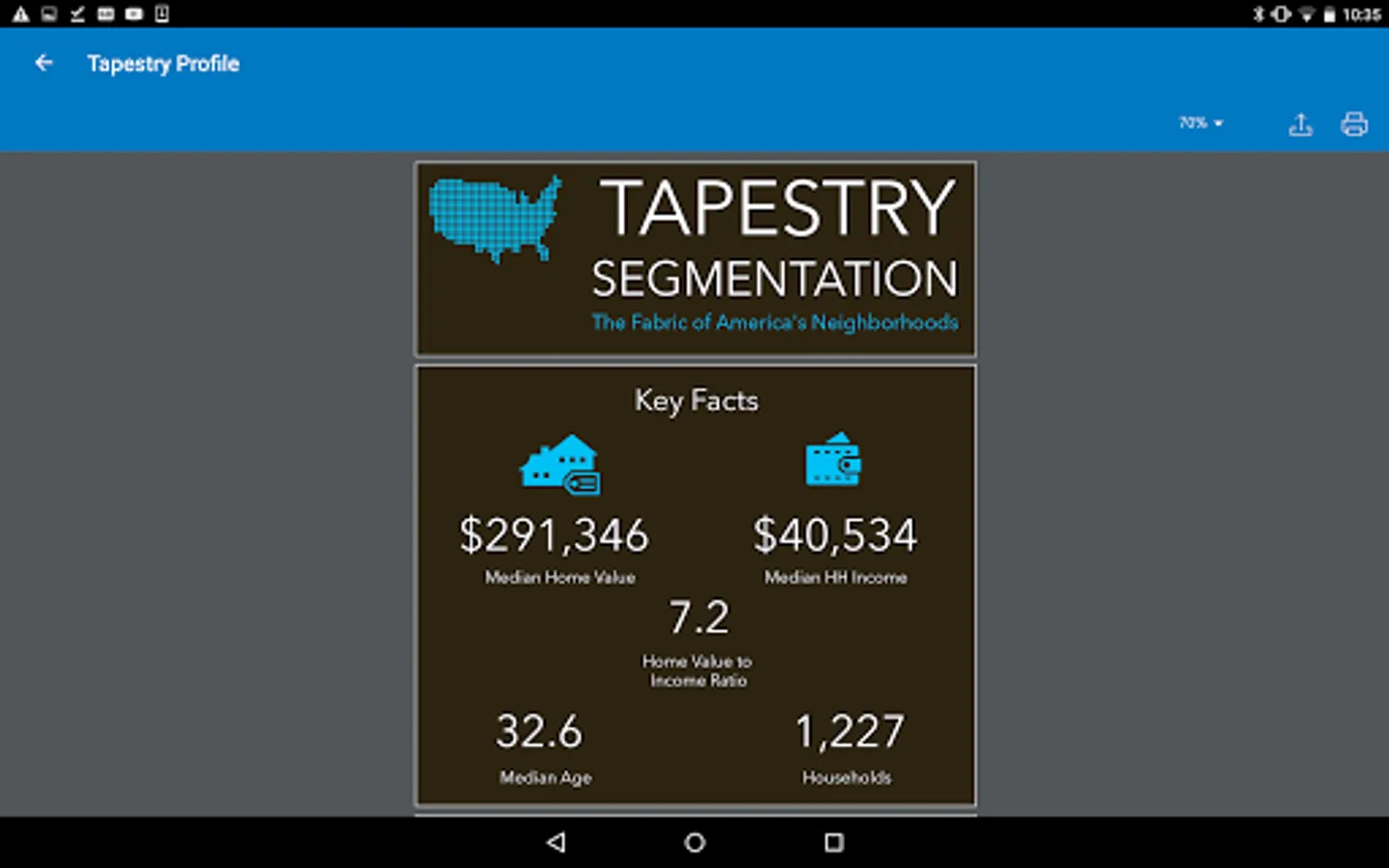 * Tap into a large collection of demographic data, reports, infographics, and maps., collect location information in the field, and easily share them with your team.