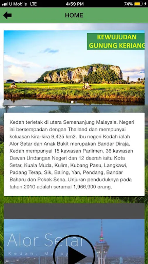 Kedah suatu negeri yang terletak di utara tanah air. Kedah mempunyai banyak tempat-tempat menarik yang boleh di lawati dan terdapat makanan tradisional Kedah yang terkenal. App ini akan memperkenalkan tentang negeri Kedah Darul Aman.