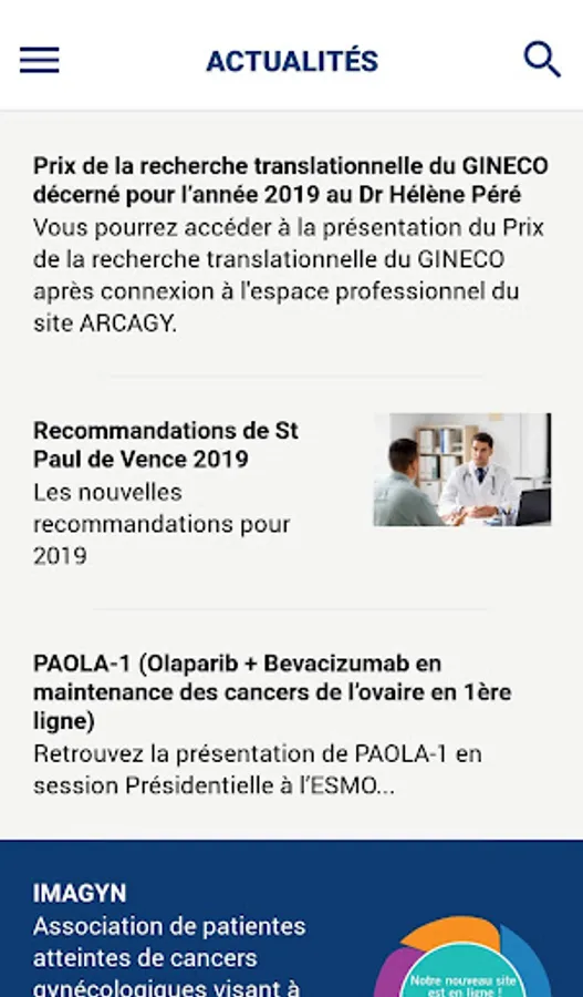 The information appearing on the ARCAGY-GINECO application does not directly or indirectly constitute an opinion or a medical consultation. They are not intended to replace the advice, treatment or recommendations offered by your healthcare professionals. In the event of a question or need concerning his health, the user must consult and respect the advice of his doctor and of the other health actors who ensure his follow-up.