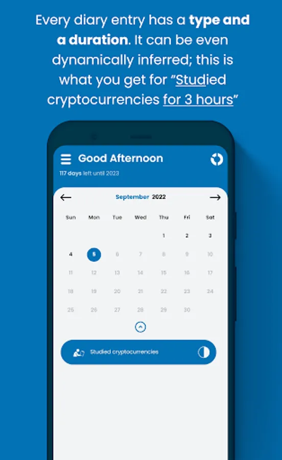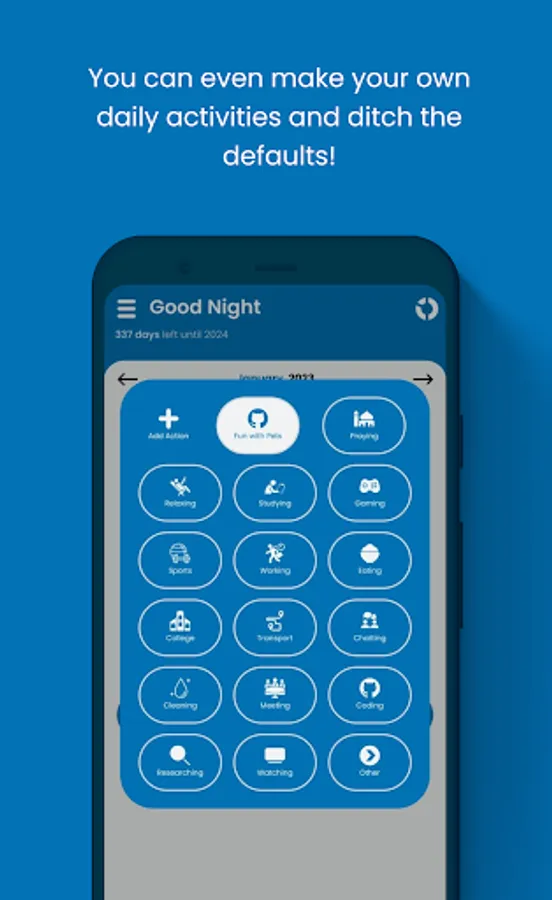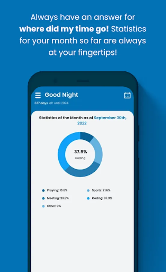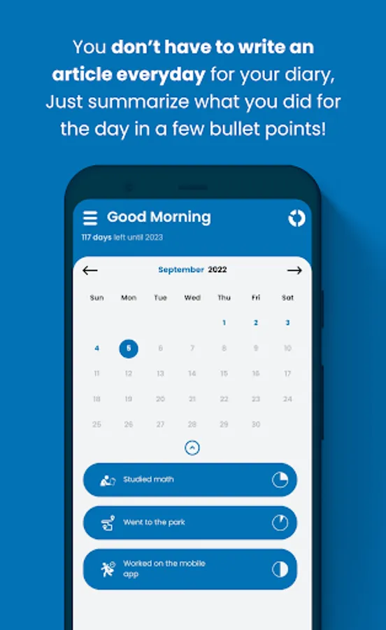 For logging your day, Instead of writing a prose for what you did, you simply convey your main activities for that day in a few bullet points! The process takes no time and you get to track what you do everyday in order to maximize your productivity! You can ascribe each daily task you write into one of the default actions or even make your own! You can also set time for each daily activity to have access to daily statistics on the month so far that answer "Where does my time go?" .