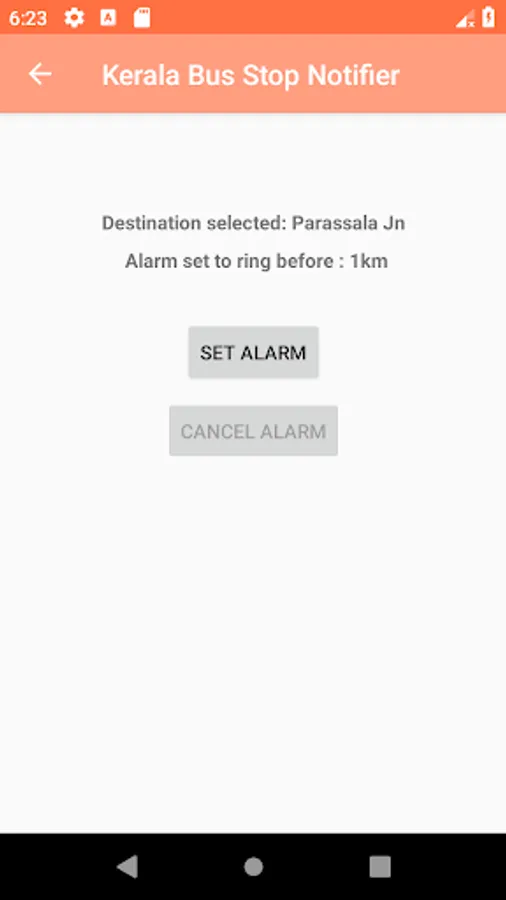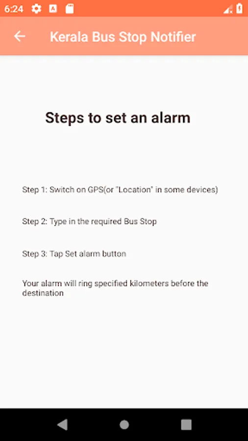 While enjoying the scenic beauty of God's own county Kerala in your beloved KSRTC, or while dozing off on a long bus journey at night, we want you to be stress free at least from the fear of missing your destination to get down. Once you are inside the bus, open the app, set your destination, specify how many kilometres prior would you like to be notified, and our app will take care to ring an alarm before the bus reaches there. With the help of Google's geofencing and other API's, we use gprs/wifi and location services to help transform your stress to serenity.