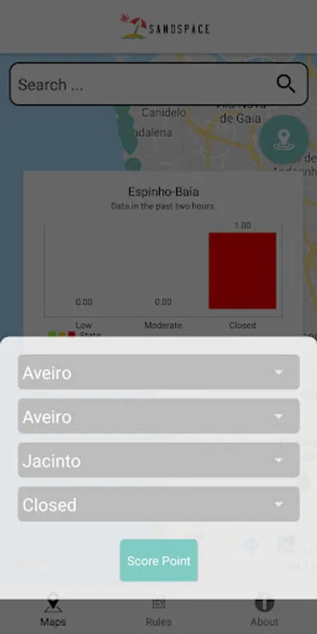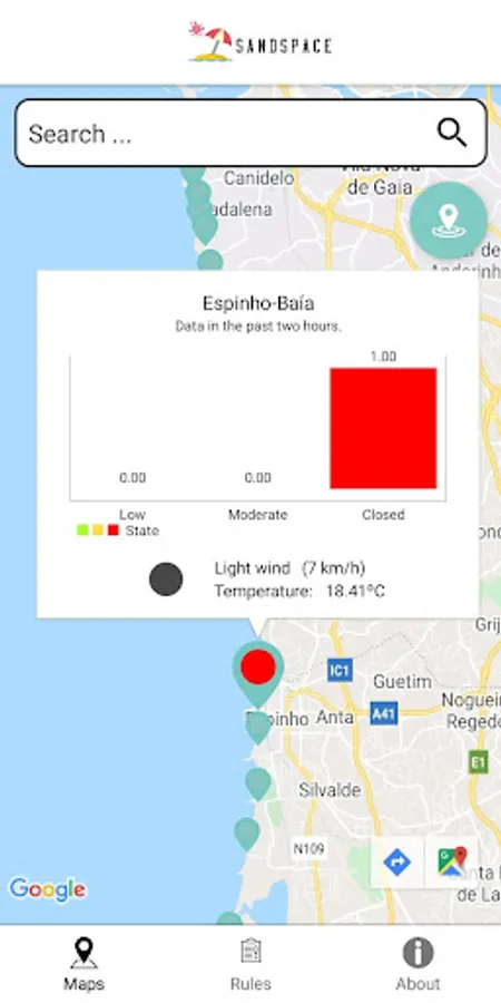 The information is provided by the users of the application and refers to the last two hours. Through a graph, SANDSPACE also indicates the number of people who gave the information and the time at which they did it.