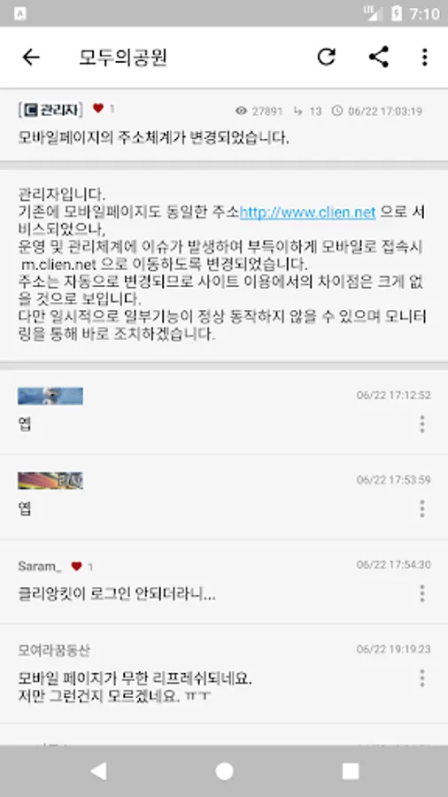 If you have any comments or bug reports while using ESCLIEN, please write to the market or send an email to eunsung223+clien@gmail.com.