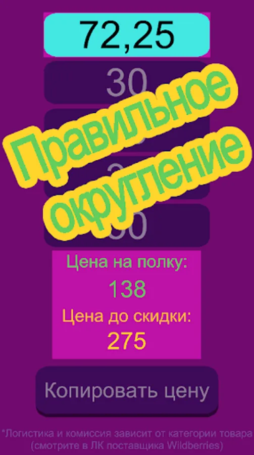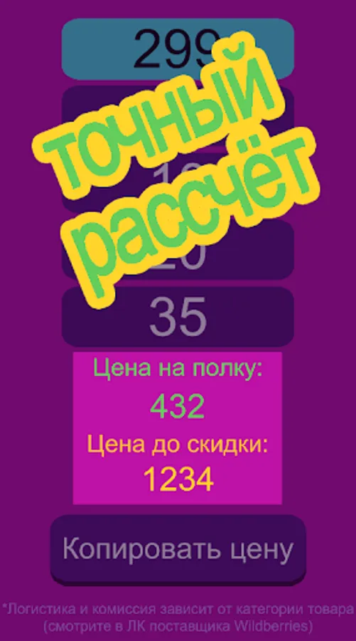 Calculates the exact selling price of a product on the Wildberries marketplace, indicating the supplier's margin (markup), Wildberries commission and logistics, and the price before the discount. An excellent calculator for easy use.