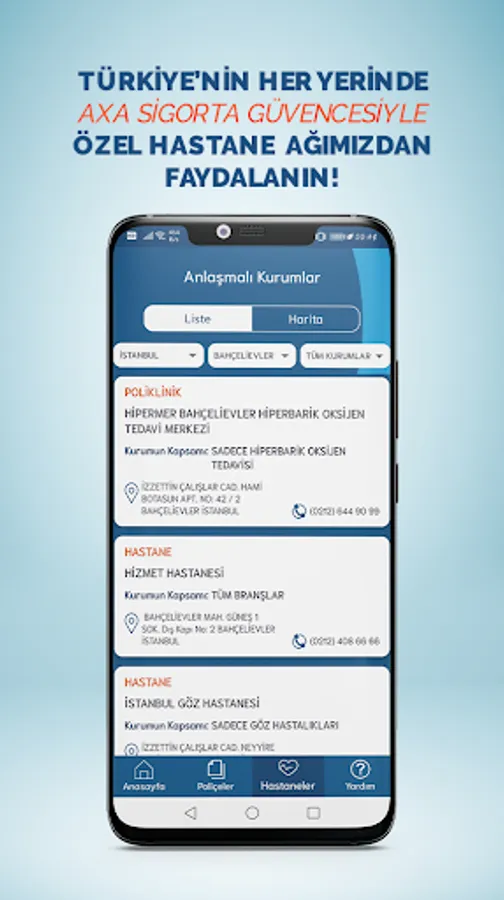 - You can filter the health institutions you can go to within the scope of your insurance according to your location, and access contact and address information on the map in our application.