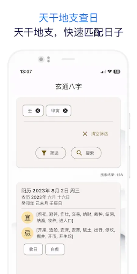 4. Date check function: you can specify the target combination of zodiac and earthly branches, and quickly search for the days that match the specified zodiac and earthly branches within the next 3 years. Through "Xuantong Bazi", you can easily inquire about the dates corresponding to a specific combination of zodiac stems and earthly branches, and view taboo information on these days. This is very helpful for choosing an auspicious date for a wedding, opening or other important event.