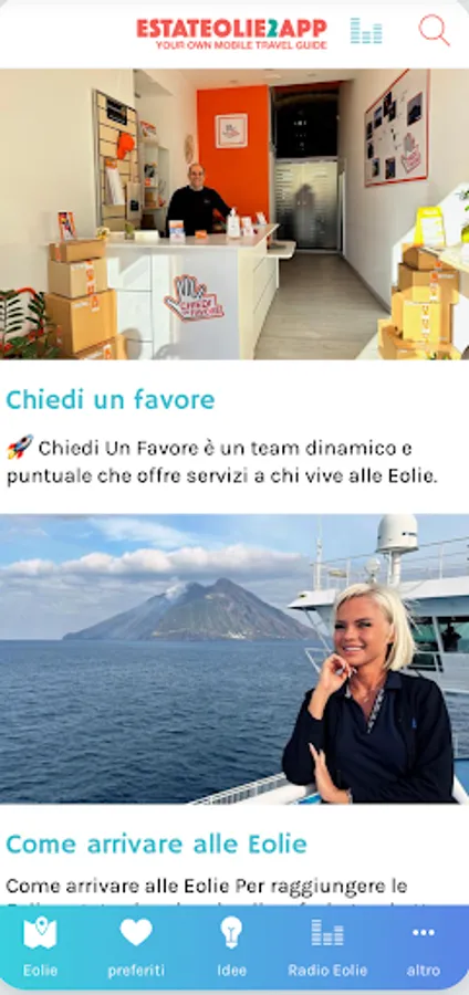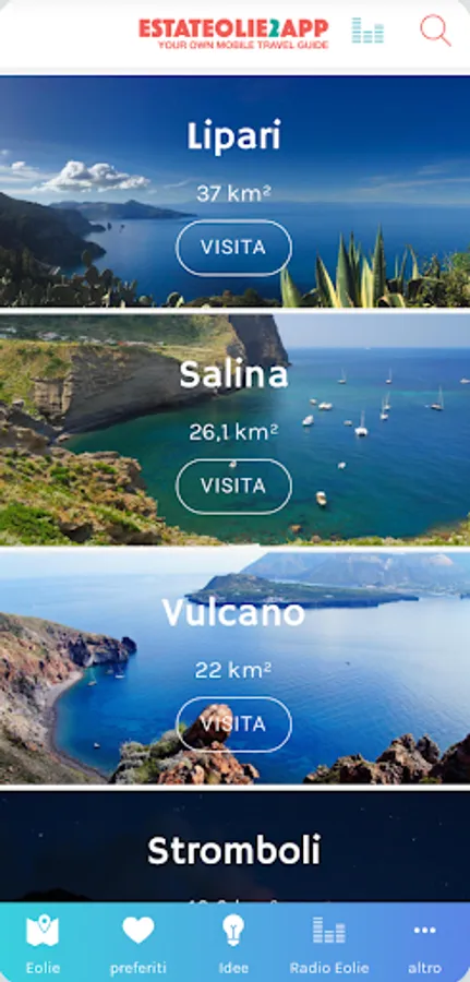Unique application of its kind that will take you to discover the Aeolian Islands: Lipari, Salina, Vulcano, Stromboli, Filicudi, Alicudi, Panarea. Estateolie2app is equipped with 700 addresses, distributed throughout the archipelago and immediately usable, via geolocation. Museums, volcanoes, beaches. Also information on where to sleep, eat and have fun on the Aeolian Islands. A complete guide of nature trails and underwater itineraries, all accompanied by descriptions, photographs and videos.