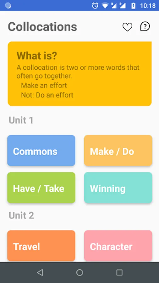 Learning Collocations is one of the best ways to sound more like native speaker. This application provides a list of Collocations, with graphical resources connecting to the meaning of each one, and visual exercises that allow you to learn them in a fun way.