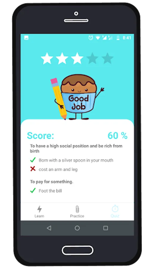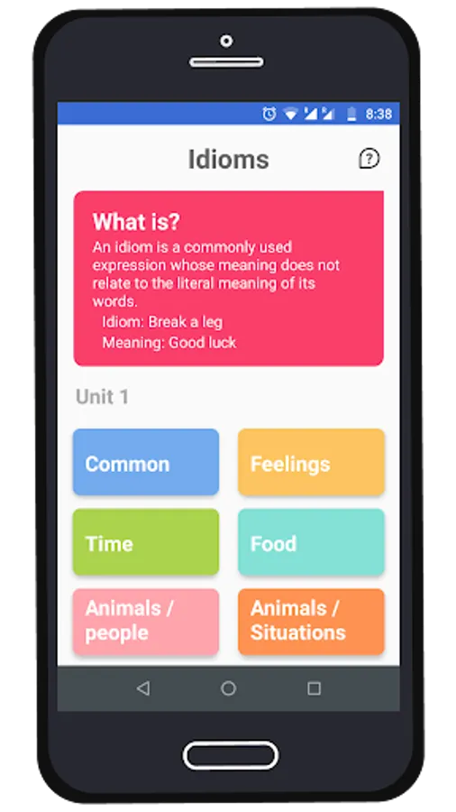 Learning idioms and expressions is one of the best ways to sound more like native speaker, because idioms don't always make sense literally, you'll need to familiarize yourself with the meaning and usage of each idiom. This application provides more than 200 idioms, with graphical resources connecting to the meaning of each one, and practical exercises that allow you to learn them in a fun way.