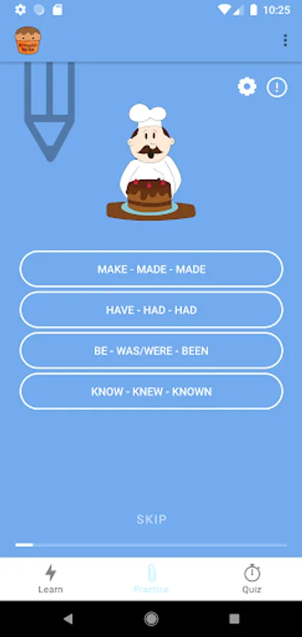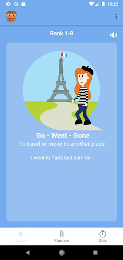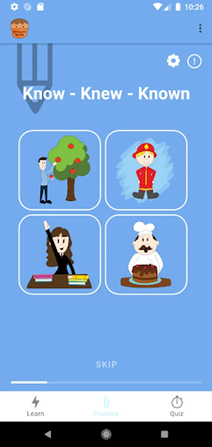 This application provides 191 irregular verbs, with graphical resources connecting to the meaning of each one, and practical exercises that allow you to learn them in a fun way.