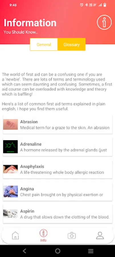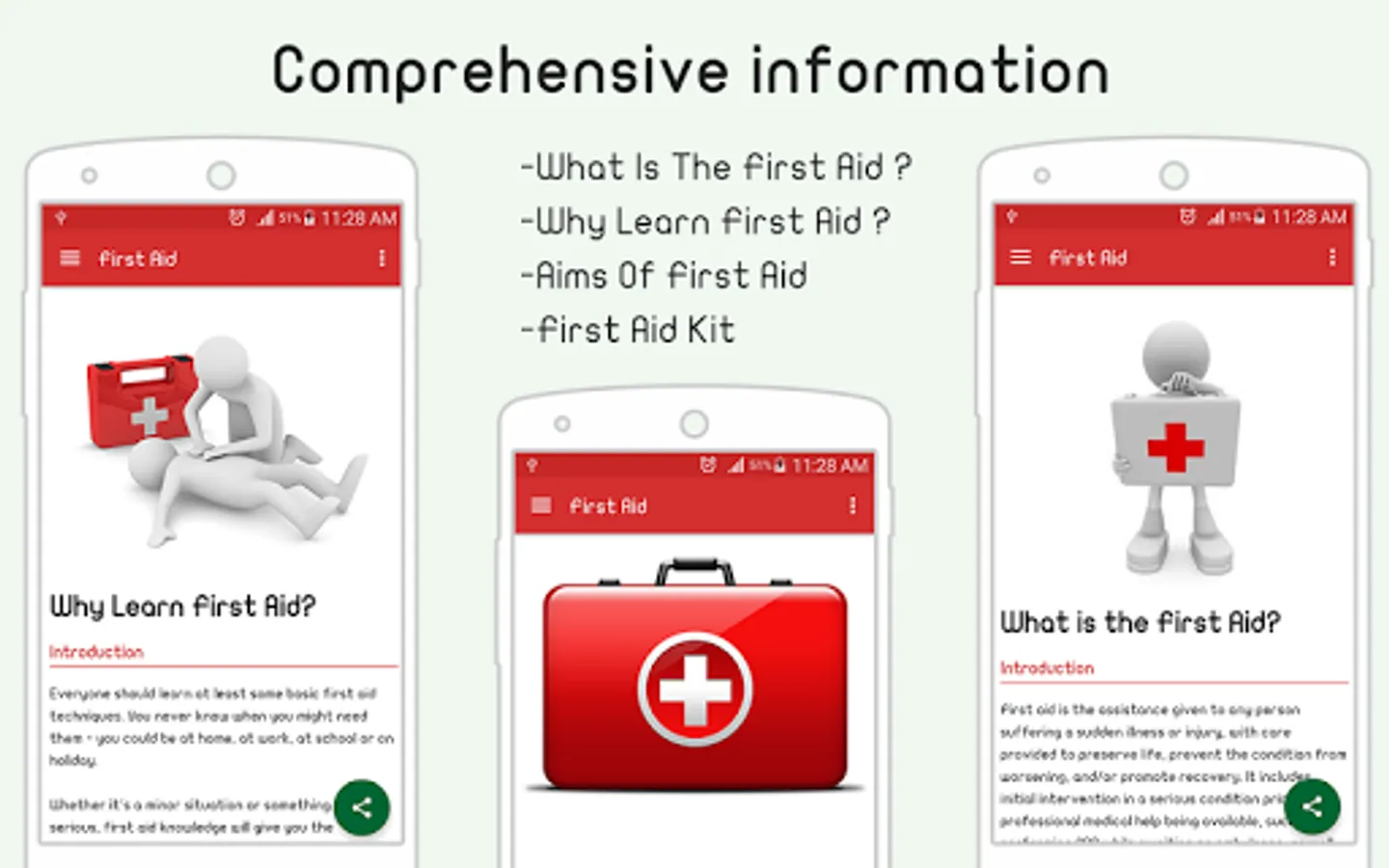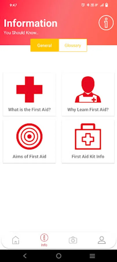 - General Information: explain what are first aid, explaining why it is important to learn first aid, and showing the aim of first aid.