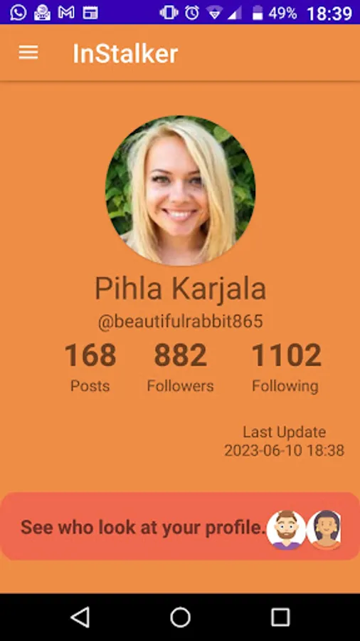 Who looked at my profile? It is very simple to access your Instagram followers and who you follow, a lot of useful information about your social media account, detailed analyses and reports.Thanks to its simple interface and easy operation, "Installer - My Profile's Viewers" will allow you to meet all your needs in a single application. If you're wondering who visited your profile, you found the follower app you were looking for. Make an analysis and find your asistant in your pocket about your Instagram account.