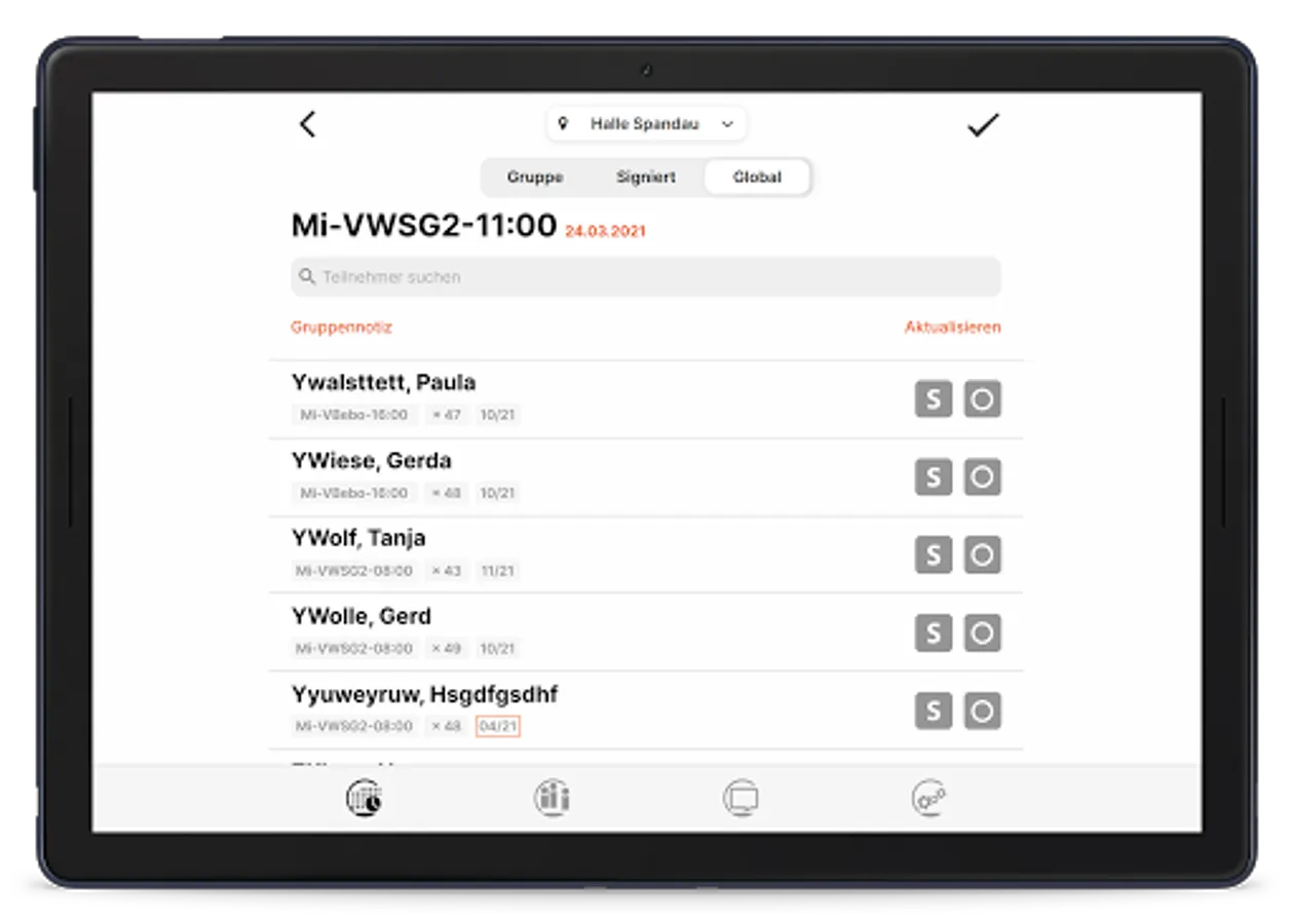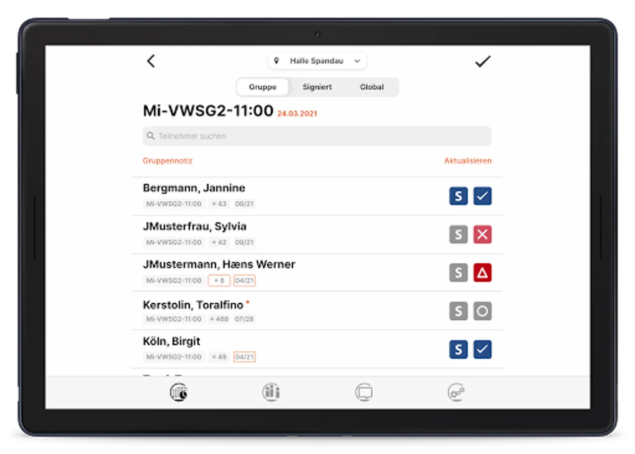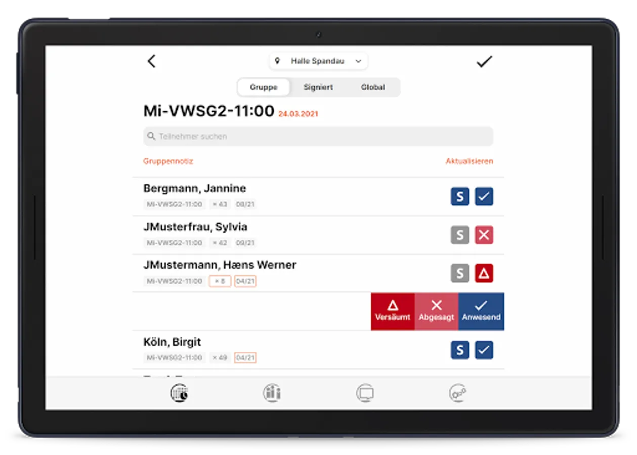 With the ULI app, as a trainer of rehab sports groups, you can digitally complete the legally required participant and group documentation with just a few "clicks", you can conveniently check the participation of your rehab athletes on the tablet in the group room and set the corresponding presence status. You can see the open units of the participants with the remaining days of the prescription and thus keep an overview at all times.
