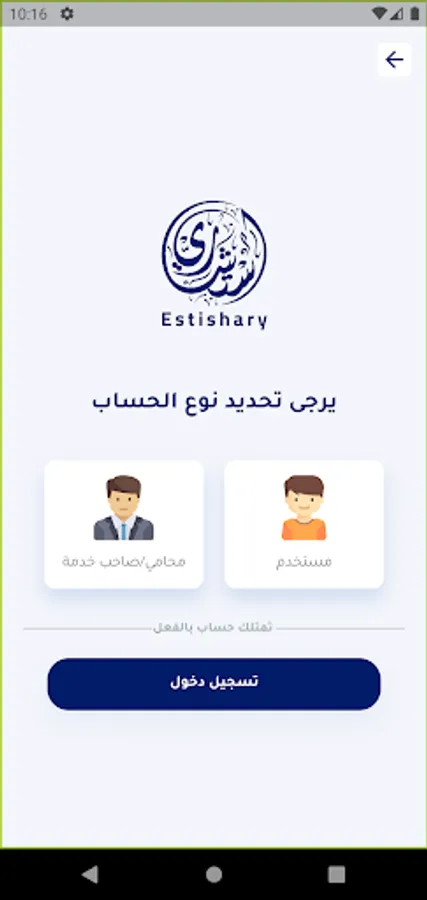 It is an electronic application specialized in legal advice and it is a direct intermediary between the community (the owner of the legal advice) and the (the legal consultant) so that the user of the application can create an account in the application and present his legal advice to the consultants and lawyers registered within the application with a fee determined by the consultant and the owner of the consultation pays Directly through the application.
