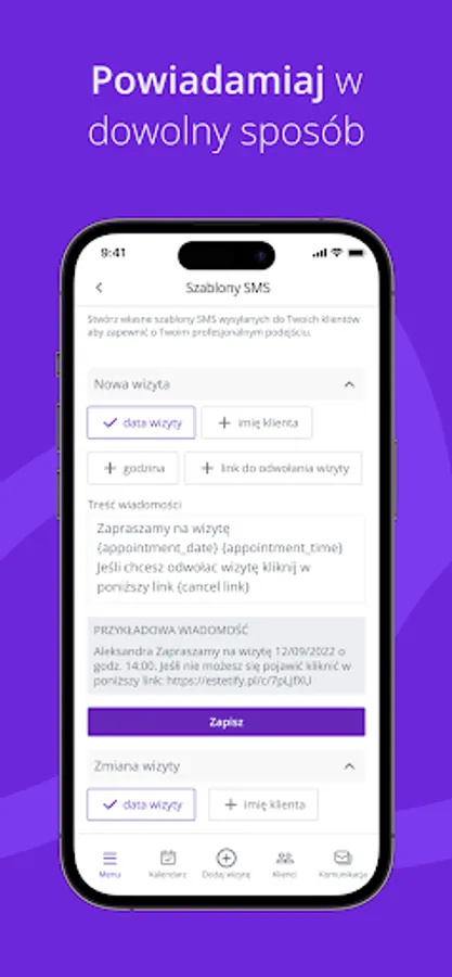 - SMS notifications and reminders - Notify the customer about the saved visit and automatically transfer the booking details. Decide on the form and content of sent messages. Personalize and use variables such as customer name, date of visit and many more,