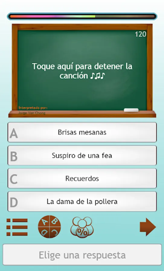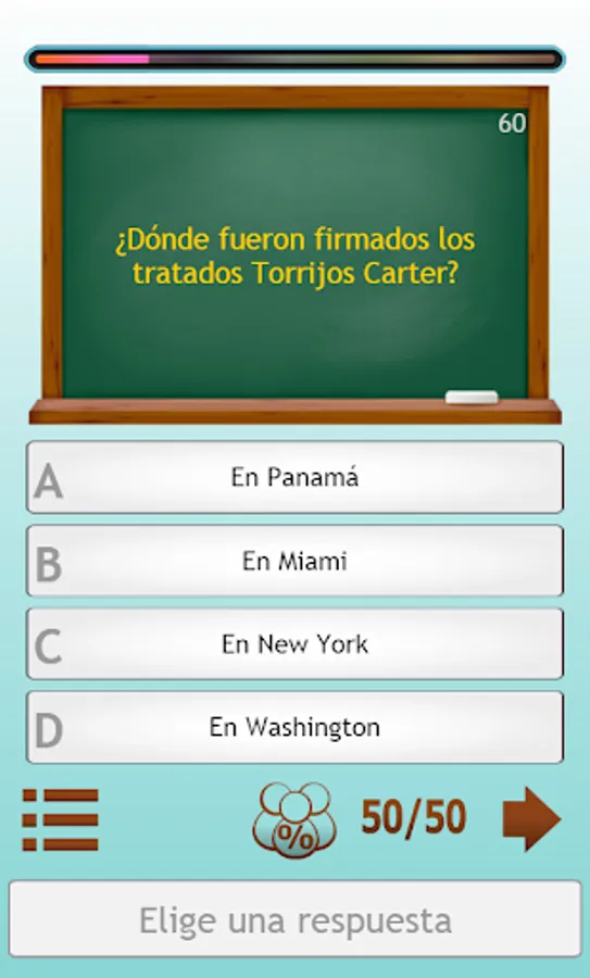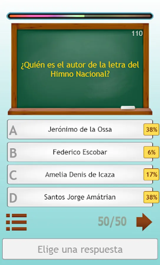 In this fun game you will find yourself with questions on different topics which you must answer by choosing the answer A, B, C, or D. In Student Mode you have the possibility of using three different wildcards that will facilitate the way for you to choose the most correct answer. For each correct answer you will get a score that will allow you to climb through the different levels of the game where the only limit is set by you.