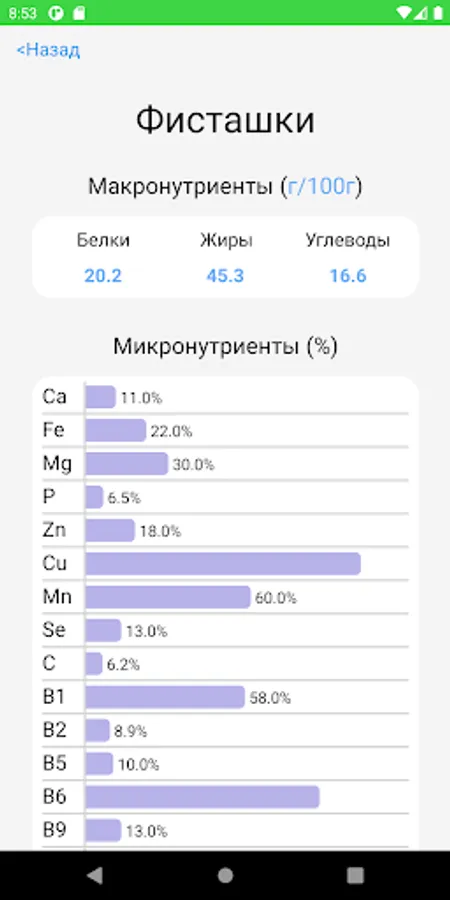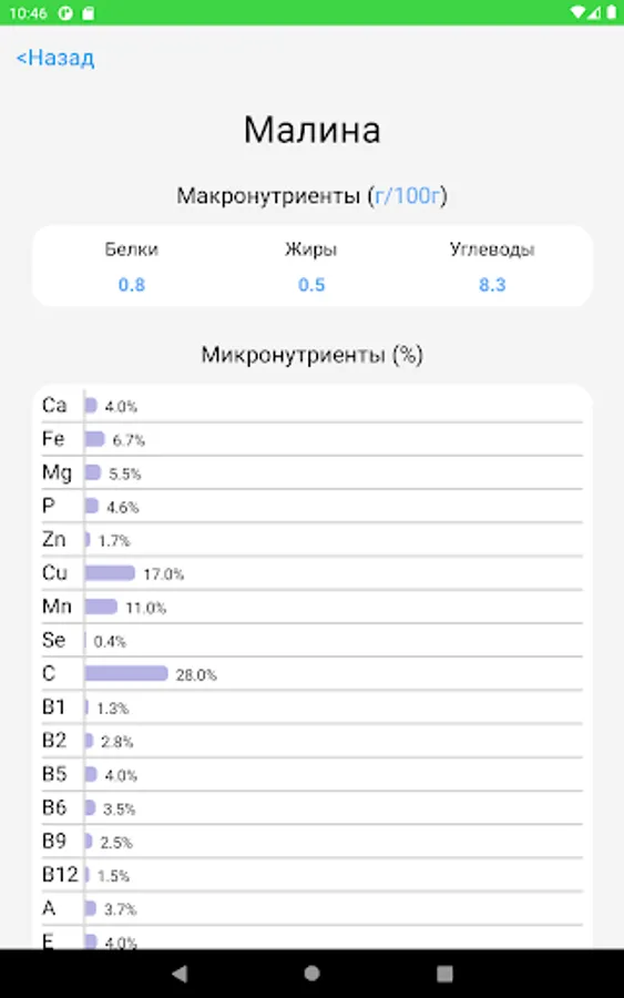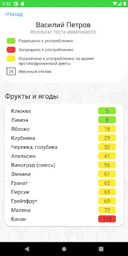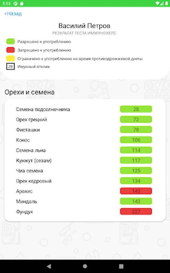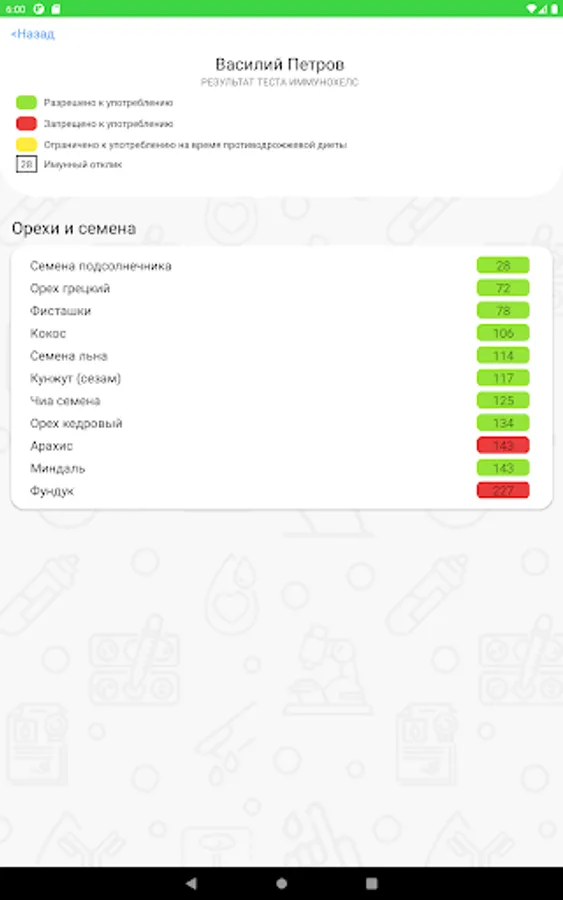 The application is designed to display the results on the immunological intolerance of the body of 90 products.