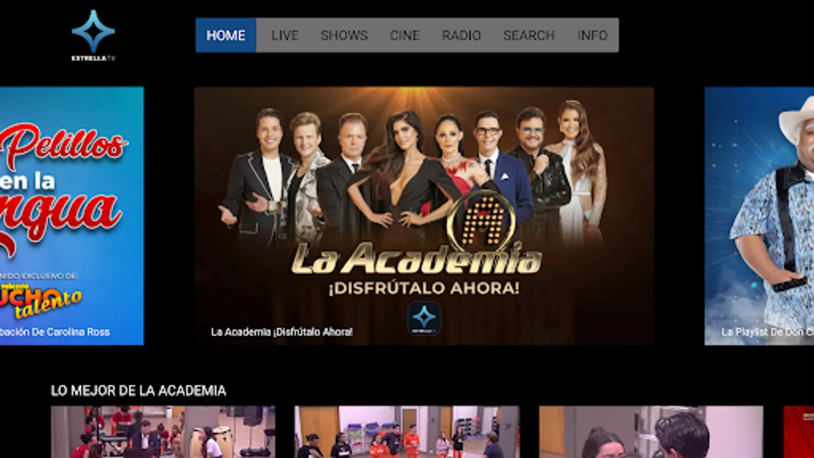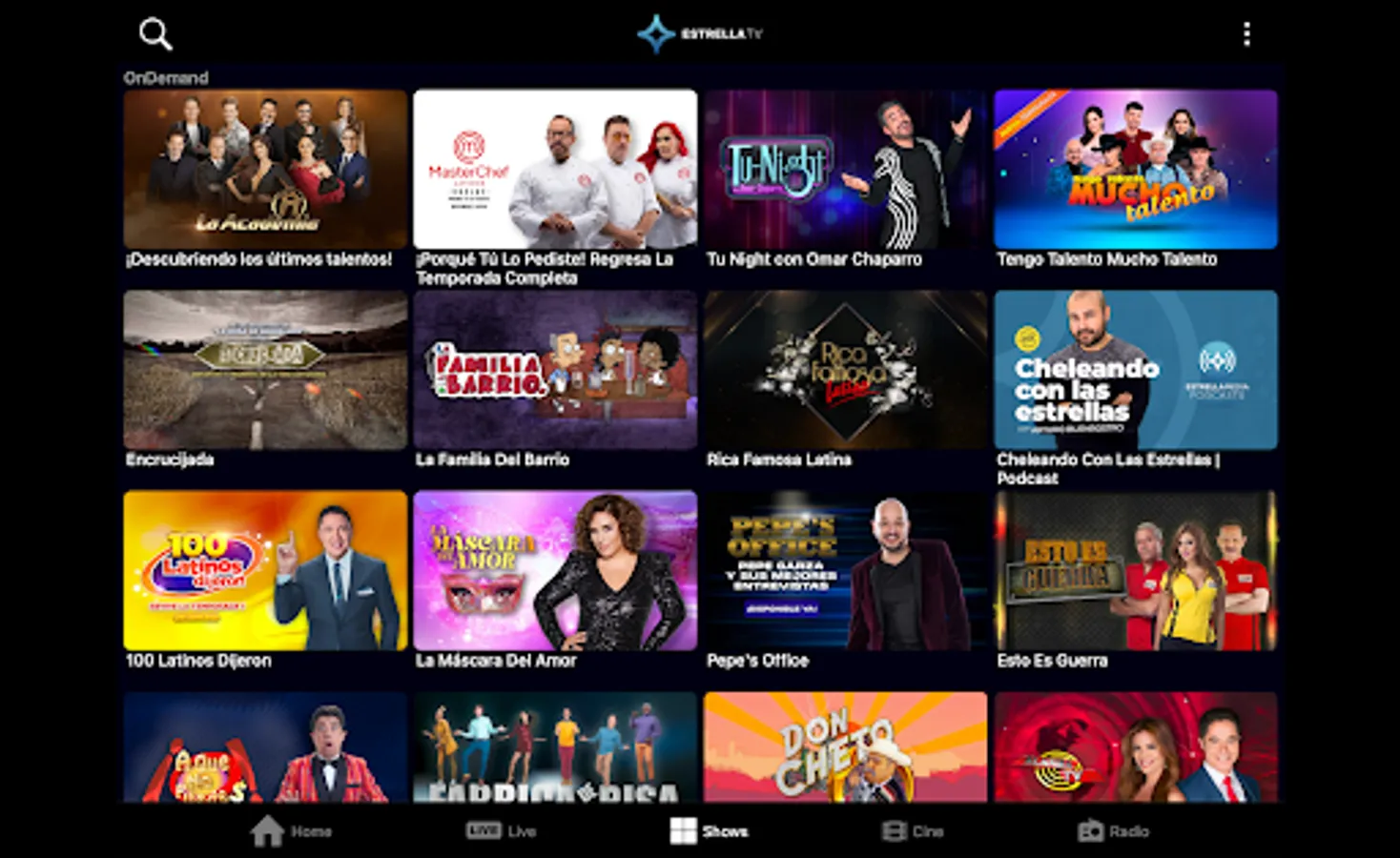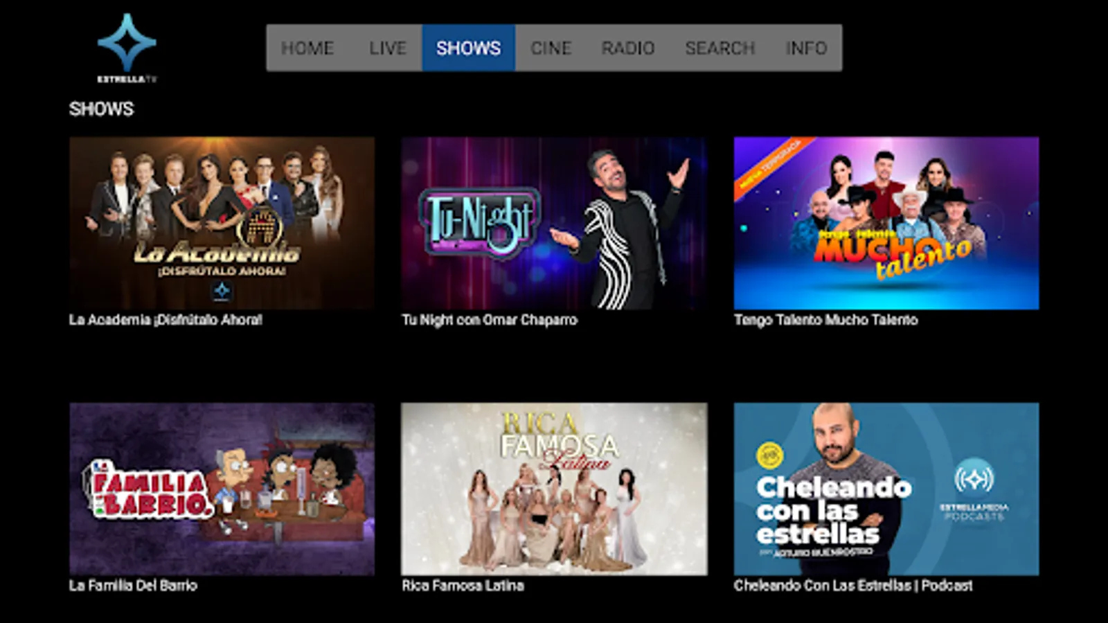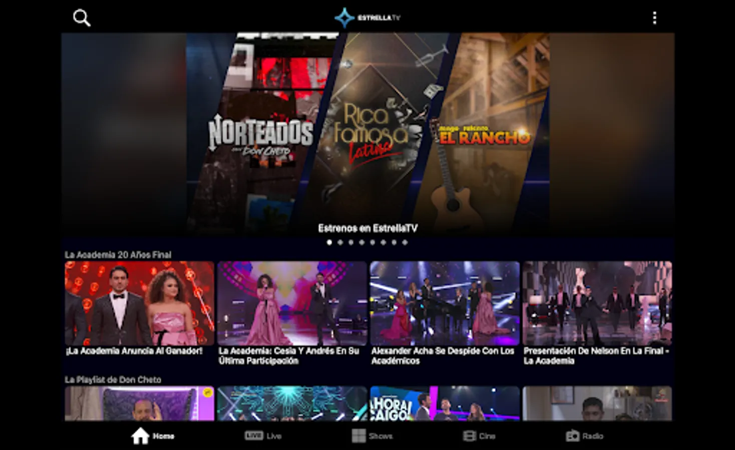 EstrellaTV is the home of Tengo Talento, Mucho Talento, Don Cheto and more. Completely in Spanish. Always Free! Watch Live TV, sports and news, listen to Regional Mexican radio and discover thousands of hours of original series and movies, reality TV, talent competitions, game shows, concerts, morning and late-night talk shows. It’s an unforgettable experience with artists like Omar Chaparro, Angélica Vale, Don Cheto, Luis Coronel, Ana Bárbara, Chiquis Rivera, Alex Montiel, and many more. Over 20,000 hours of original and exclusive entertainment for you. Enjoy entertaining and unexpected Spanish shows: Tengo Talento, Mucho Talento, MasterChef Latinos, Tu-Night con Omar Chaparro, La Academia, La Máscara del Amor, Rica Famosa Latina, Noches con Platanito, El Show de Jenni Rivera, 100 Latinos Dijeron, Nos Cayó la Noche con Alex Montiel and more! Streaming in Spanish, ABSOLUTELY FREE! No registration or credit cards. Live TV and Radio. Be the first to watch Original and exclusive content. Over 20,000 programming hours of your favorite shows anytime, anywhere.