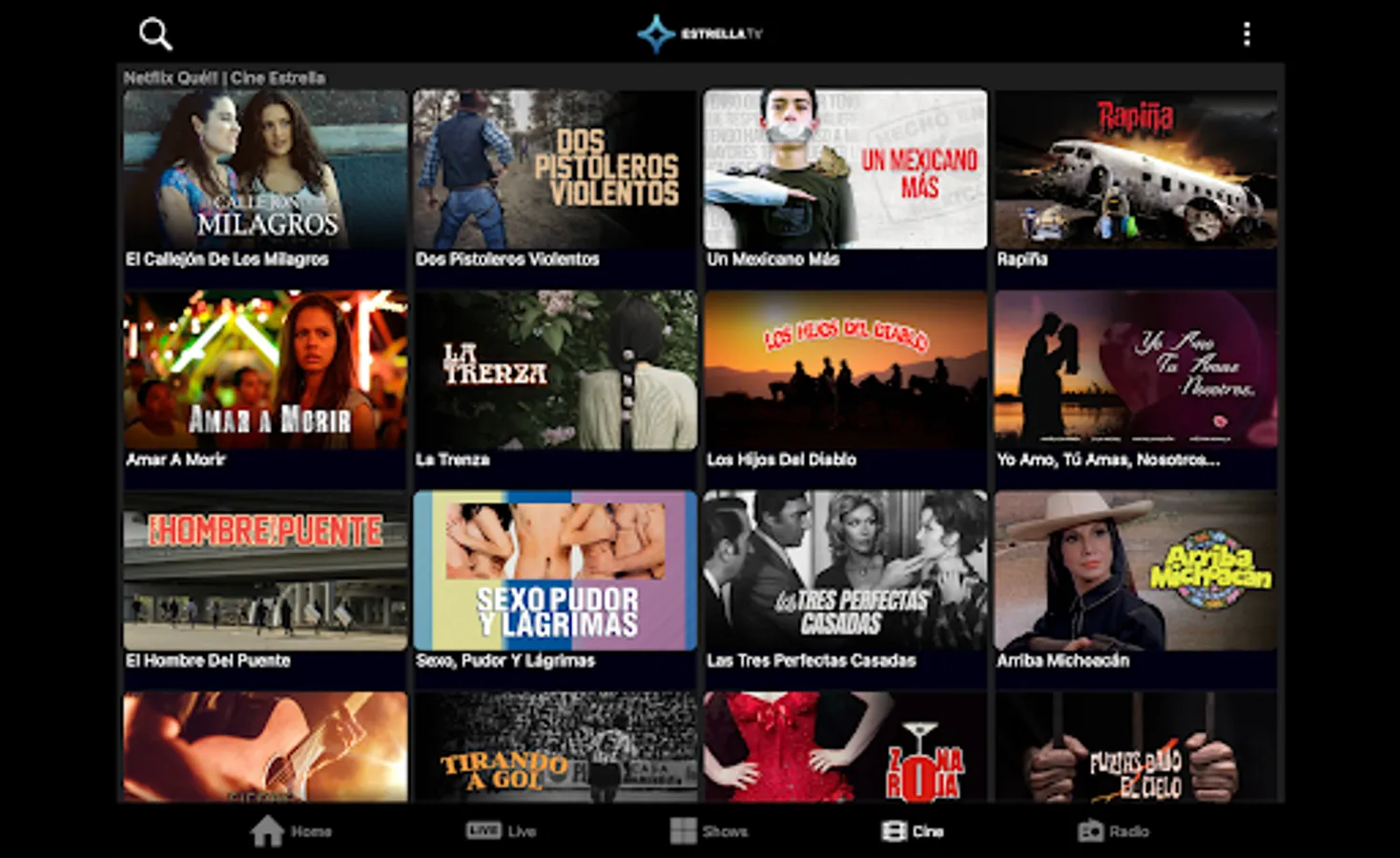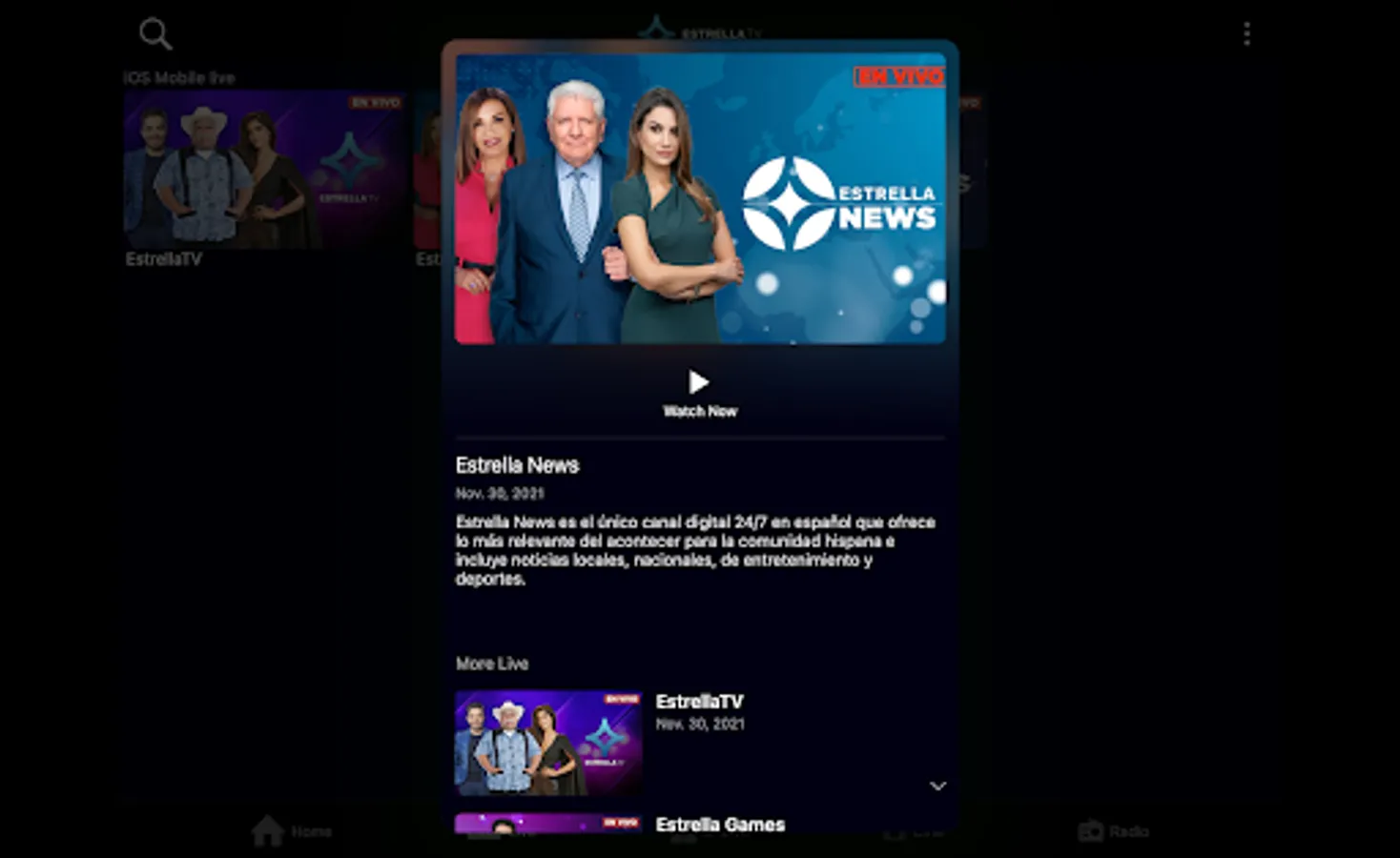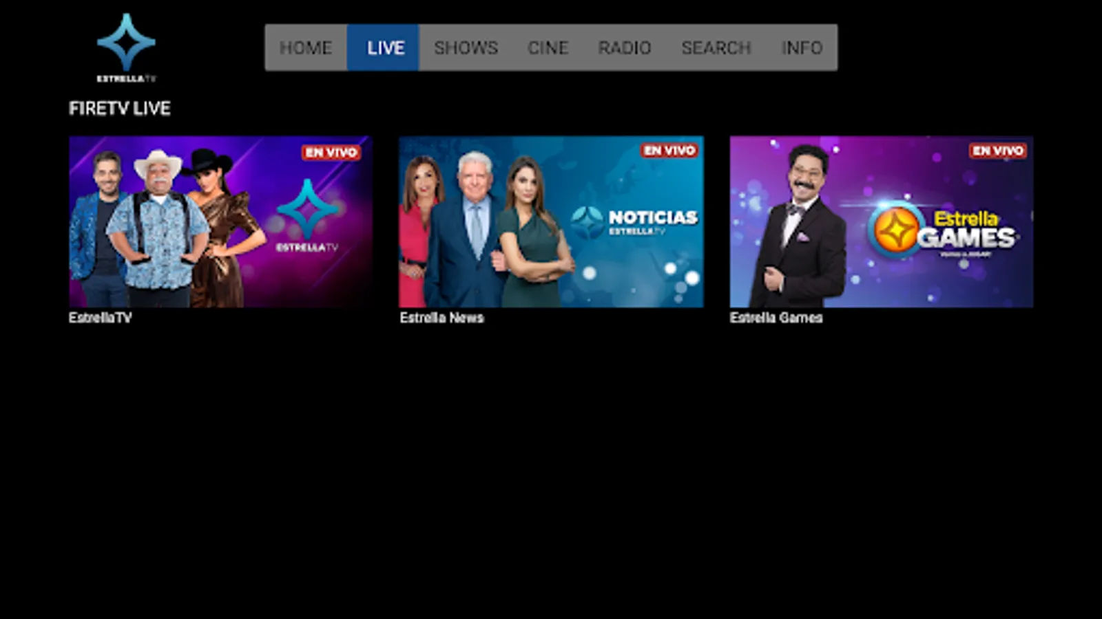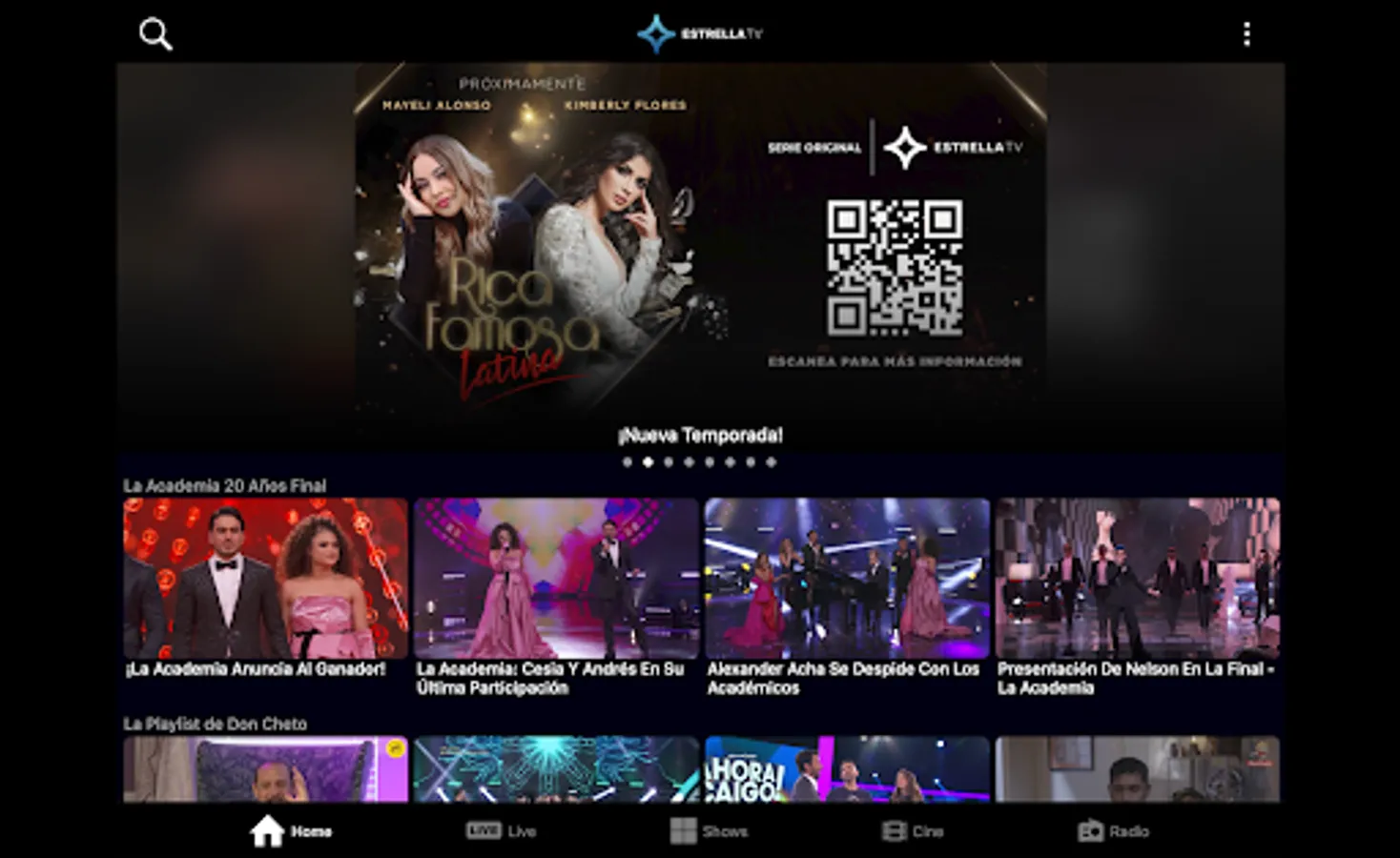 EstrellaTV is the home of Tengo Talento, Mucho Talento, Don Cheto and more. Completely in Spanish. Always Free! Watch Live TV, sports and news, listen to Regional Mexican radio and discover thousands of hours of original series and movies, reality TV, talent competitions, game shows, concerts, morning and late-night talk shows. It’s an unforgettable experience with artists like Omar Chaparro, Angélica Vale, Don Cheto, Luis Coronel, Ana Bárbara, Chiquis Rivera, Alex Montiel, and many more. Over 20,000 hours of original and exclusive entertainment for you. Enjoy entertaining and unexpected Spanish shows: Tengo Talento, Mucho Talento, MasterChef Latinos, Tu-Night con Omar Chaparro, La Academia, La Máscara del Amor, Rica Famosa Latina, Noches con Platanito, El Show de Jenni Rivera, 100 Latinos Dijeron, Nos Cayó la Noche con Alex Montiel and more! Streaming in Spanish, ABSOLUTELY FREE! No registration or credit cards. Live TV and Radio. Be the first to watch Original and exclusive content. Over 20,000 programming hours of your favorite shows anytime, anywhere.