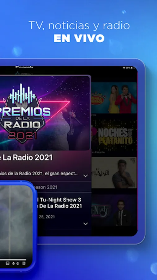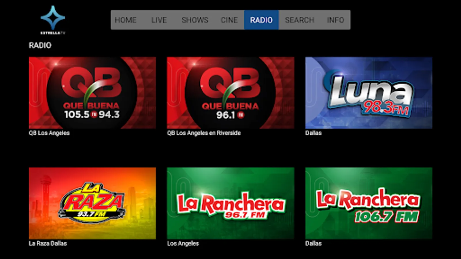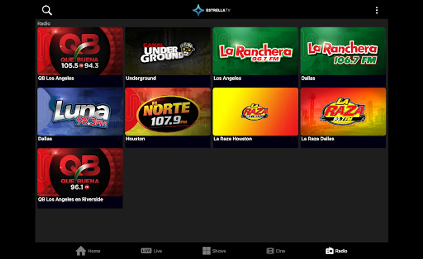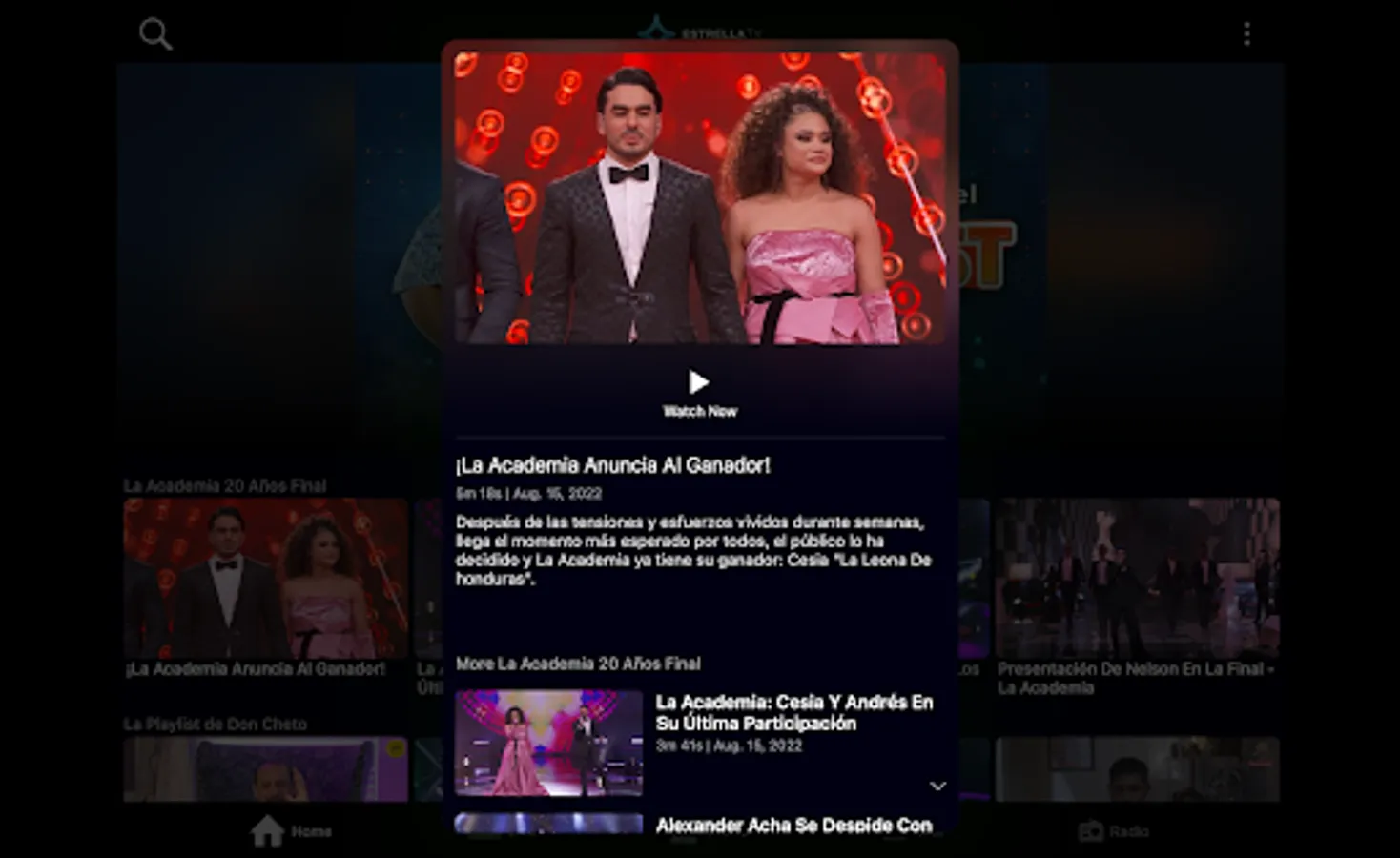 EstrellaTV is the home of Tengo Talento, Mucho Talento, Don Cheto and more. Completely in Spanish. Always Free! Watch Live TV, sports and news, listen to Regional Mexican radio and discover thousands of hours of original series and movies, reality TV, talent competitions, game shows, concerts, morning and late-night talk shows. It’s an unforgettable experience with artists like Omar Chaparro, Angélica Vale, Don Cheto, Luis Coronel, Ana Bárbara, Chiquis Rivera, Alex Montiel, and many more. Over 20,000 hours of original and exclusive entertainment for you. Enjoy entertaining and unexpected Spanish shows: Tengo Talento, Mucho Talento, MasterChef Latinos, Tu-Night con Omar Chaparro, La Academia, La Máscara del Amor, Rica Famosa Latina, Noches con Platanito, El Show de Jenni Rivera, 100 Latinos Dijeron, Nos Cayó la Noche con Alex Montiel and more! Streaming in Spanish, ABSOLUTELY FREE! No registration or credit cards. Live TV and Radio. Be the first to watch Original and exclusive content. Over 20,000 programming hours of your favorite shows anytime, anywhere.