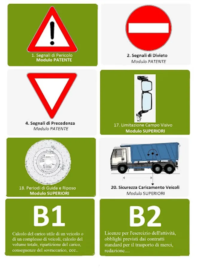 - CREATE a tab on the "individual" ARGUMENTS THAT YOU WANT. For example you can select the warning signs, the above (B license modules) + visual field limitation linked to the characteristics of the vehicle (license module Upper C) + Module B1 (CQC goods form)