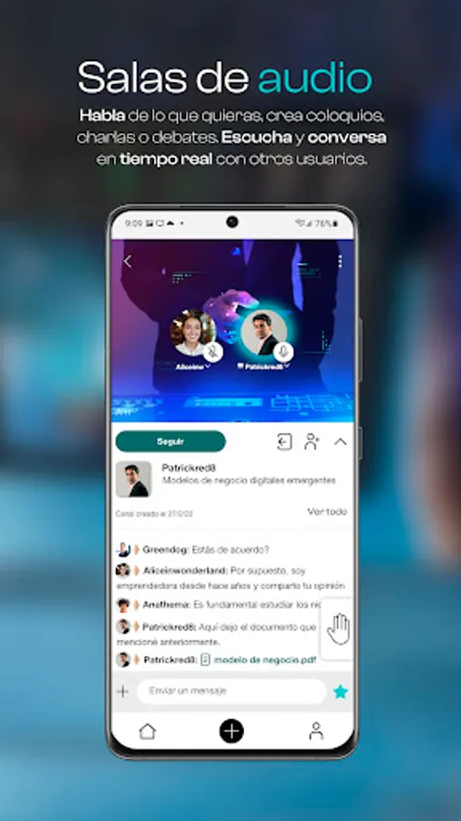 2. Enter the audio rooms and enjoy talks and debates. Share opinions and make friends. Interact in the room chat, connect with users with the same interests and follow them to keep up to date with their publications.