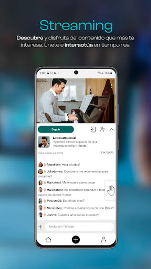 1. Explore the video channels and enjoy the live streams of your favorite content creators. Interact in the channel chat, connect with users with the same interests and follow them to keep up to date with their posts. Raise your hand to participate and share your experience with the audience.