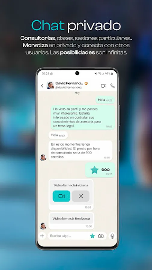6. Talk to your friends, family or clients, send documents, photos, videos, audios and gifs. Send your location and record voice messages. Make calls and video calls, send and receive stars in consultancies, private classes or private sessions and meet people on Estrim.