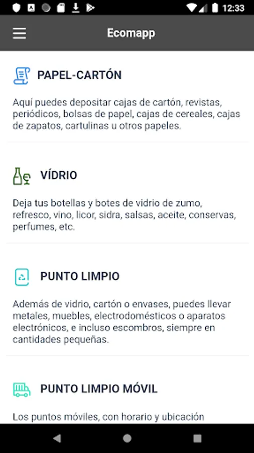 Find the cardboard, paper, glass, clothing, fixed and mobile clean spots, batteries, oil and containers closest to you in Madrid. We will continue to expand with new containers of other types of waste. The information is published by the Madrid City Council.