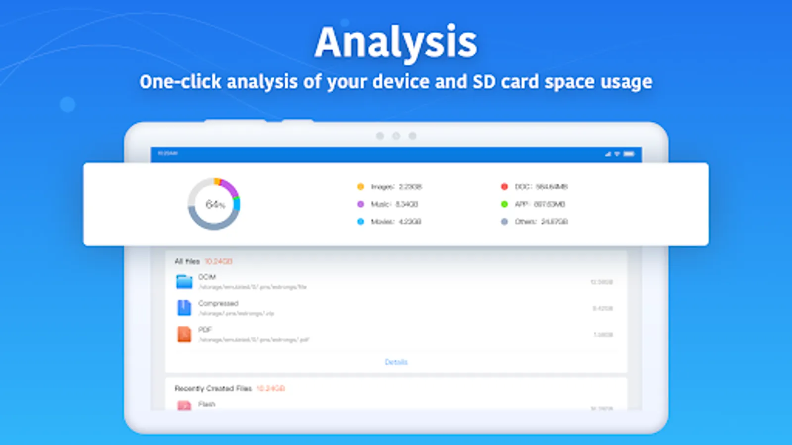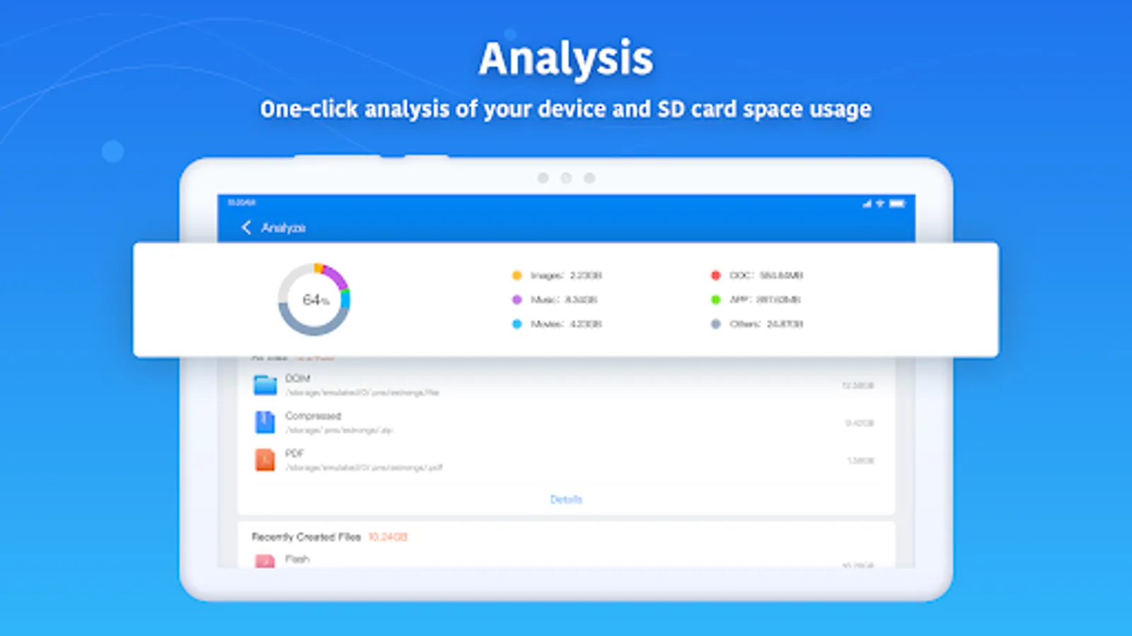 Disk Analysis: Analyze your space usage, large files, file categories, recent files, folder sizes