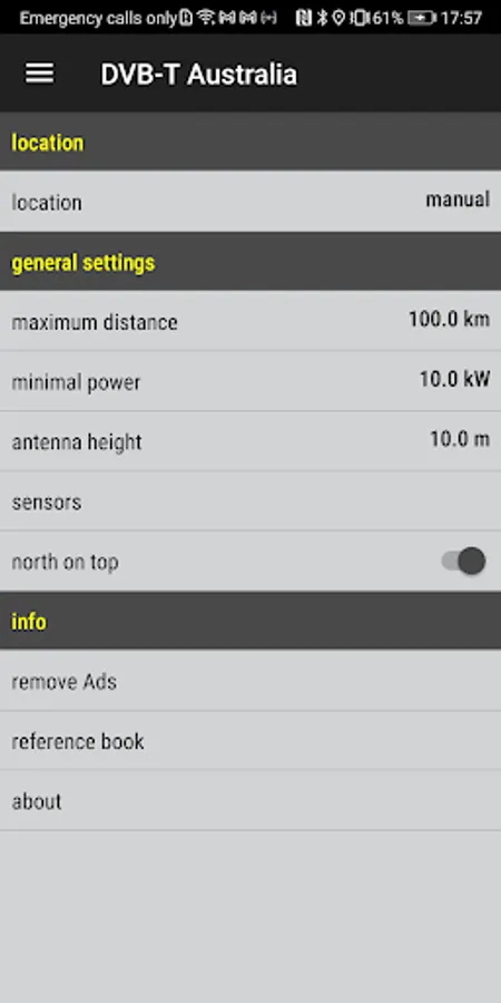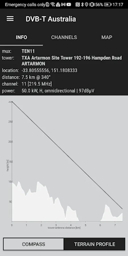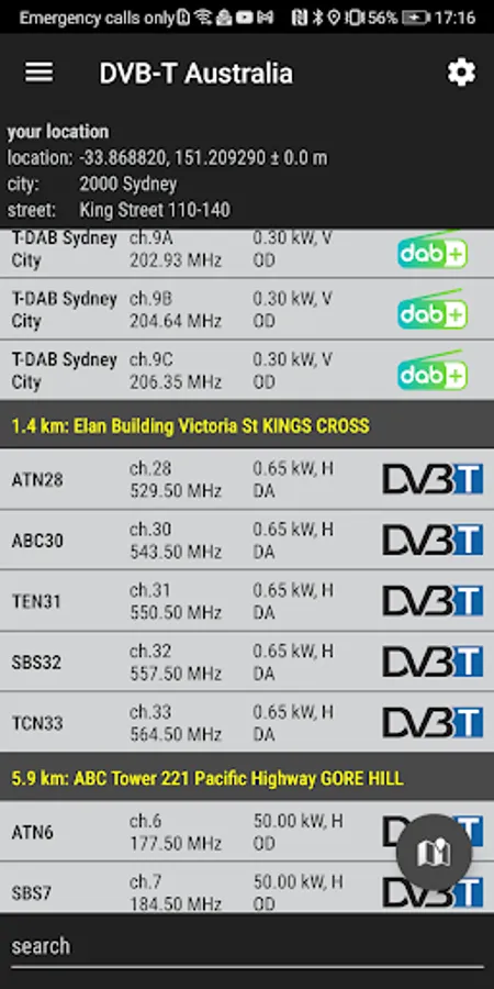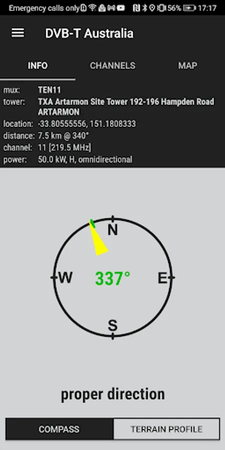 This tool will help you find nearest DVB-T channels. It uses GPS and Internet. DVB-T finder shows channel number, frequency, power, polarization of the signal, azimuth, channel list, elevation chart (work slow) and shows map