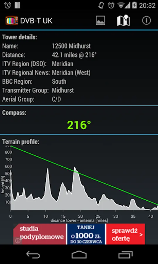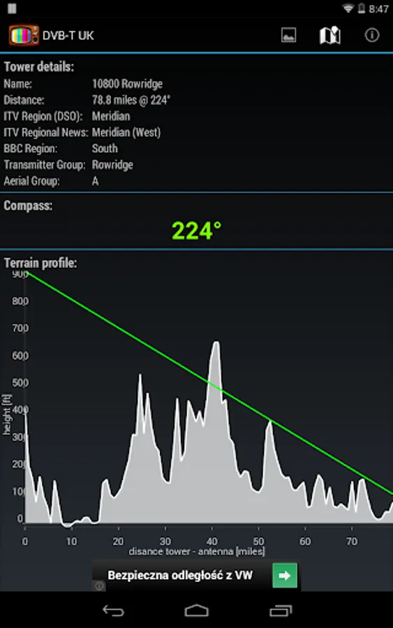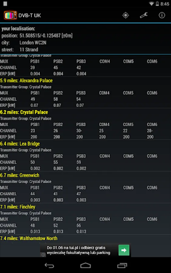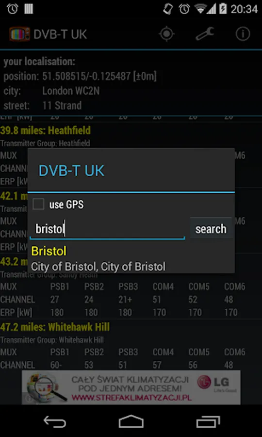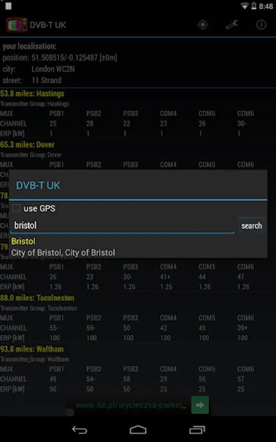 DVB-T UK is app which will help you to find nearest DVB-T transmitters in UK. It uses GPS, so the app need some time to find proper position. App will work proper only in UK.
