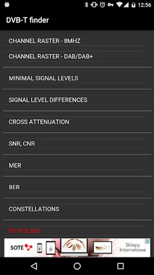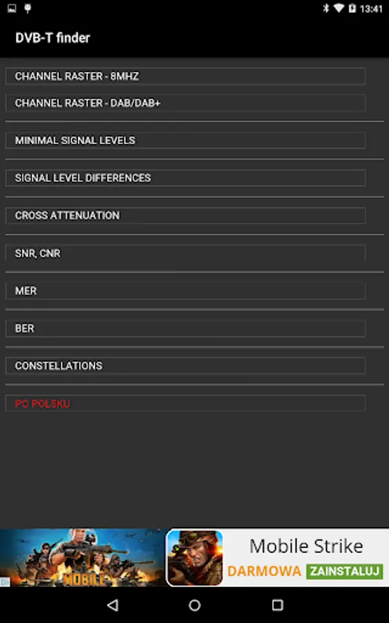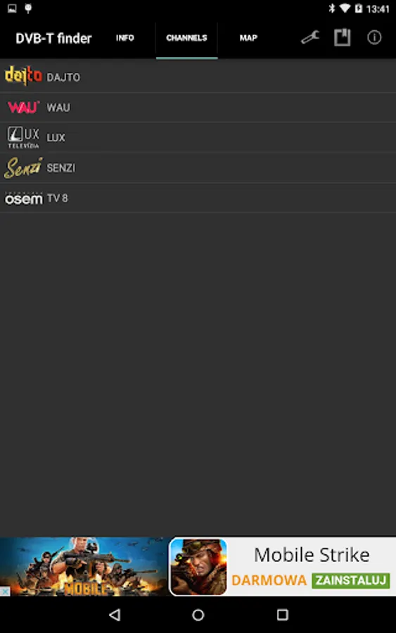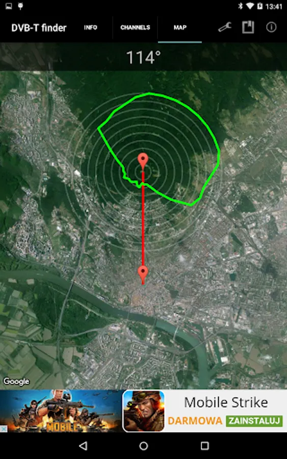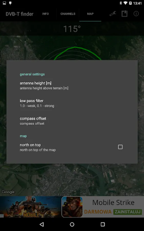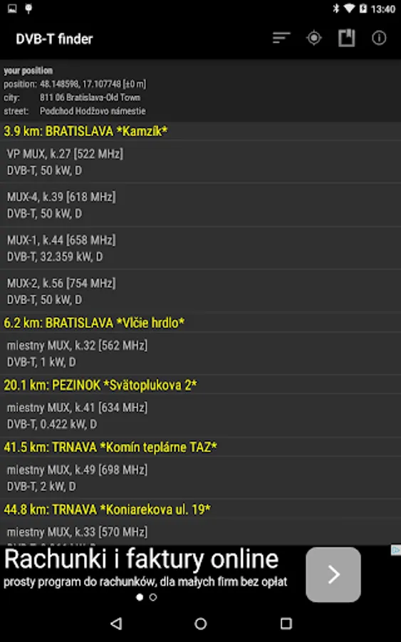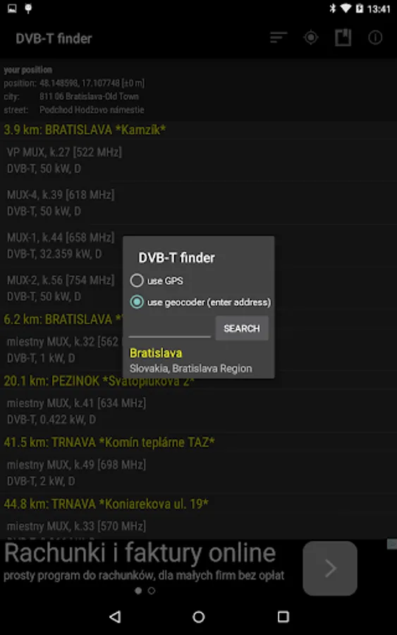 This tool will help you find nearest DVB-T channels. It uses GPS and Internet. DVB-T finder shows channel number, frequency, power, polarisation of the signal, azimuth, channel list, elevation chart (work slow) and shows map